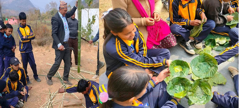 पर्वत जलजलाको एक विद्यालय डोको बुन्ने र टपरी गाँस्ने सिप सिकाउँदै