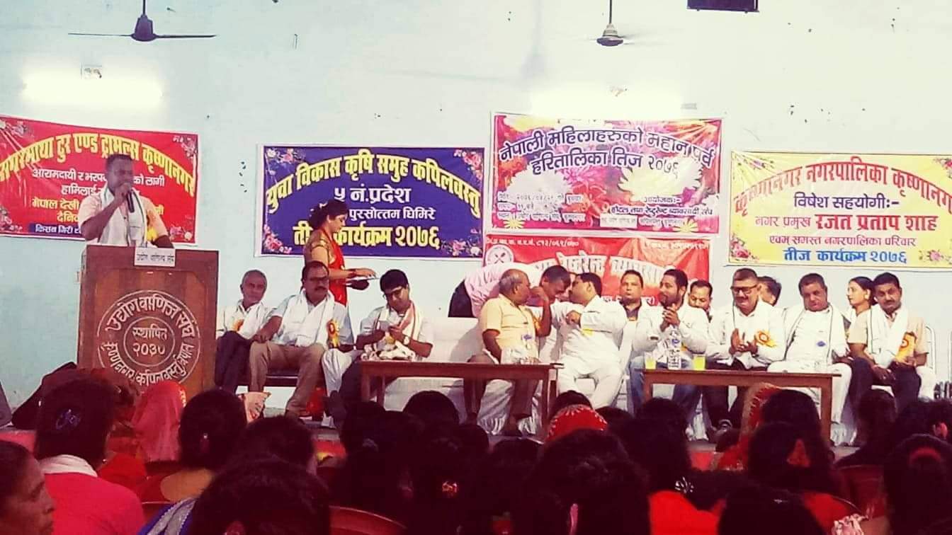 शिव प्रसाद घिमिरे को अध्यक्षता मा कार्यक्रमका प्रमुख अतिथि संघिय सांसद अभिषेक प्रताप शाह, विशिष्ट अतिथि इंडो नेपाल सामाजिक मंचका अध्यक्ष अकरम पठान, उद्योग वाणिज्य संघ कृष्णनगर का अध्यक्ष राम कुमार कौलापुरी, सशस्त्र प्रहरी का डि. एस. पी. सुशील कुमार शाही, दिनेश गुप्ता, रविंद्र गुप्ता, लक्षमण भट्टराई रहनु भयो। कार्यक्रमको शुभारंभ राष्ट्रीय गान द्वारा गर्दै अतिथि हरुलाई सम्मान गरियो। अतिथिहरुले महिलाहरु लाई आउन लागेको तीजको शुभकामना व्यक्त गरे।