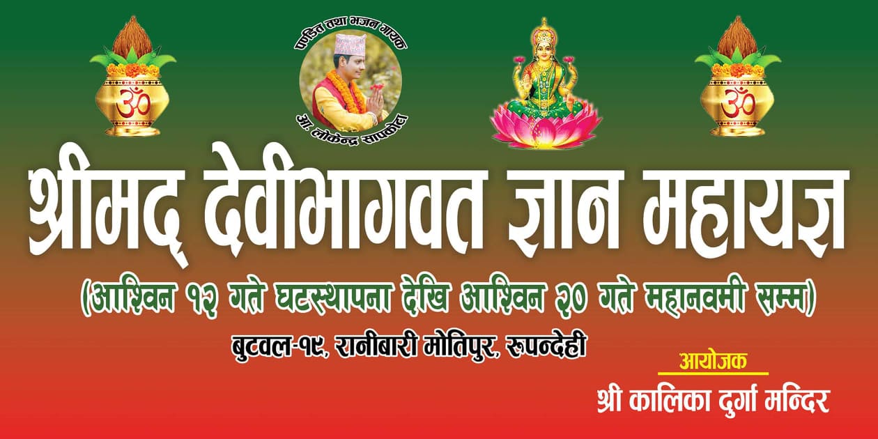 स्याङ्जालि पन्डित तथा भजन गायक लोकेन्द्र सापकोटा द्वारा श्रीमत देबि भागबत ज्ञान महायज्ञ यहि आश्विन १२ गते घटस्थापना देखि २० गते महानवमी सम्म बुटवल उपमहानगर पालिका -१९ रानिबारी मोतिपुर रुपन्देहीमा सन्चालन हुने भएको छ।