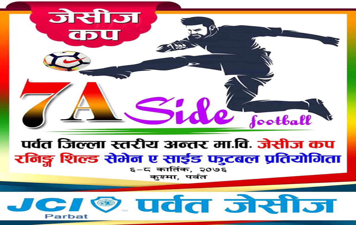 गोविन्द रिजाल, पर्बत कुश्मा ।राष्ट्र निर्माणका अभियन्ता एवं परिबर्तनका सम्बाहक १८ देखि ४० बर्षसम्मका युवाहरुमा निहित जोश र जाँगरलाई विधिको शासन, आर्थिक न्याय, बिश्व बन्धुत्व र मनबताको सेवामा समाहित गराउदै तालिम र अभ्यासको माध्यमबाट युवाहरुको ब्यक्तित्व र नेतृत्व बिकाश गर्ने उदेश्यले सन् १९९६ मा स्थापित पर्बत जेसीजले पहिलो पटक पर्वत जिल्ला स्तरीय अन्तर मा.वि. जेसीज कप सेभेन ए साईड रनिङ शिल्ड फुटवल प्रतियोगीता यहि कार्तिक ६ देखि ८ गते सम्म आयोजना गर्ने भएको छ।