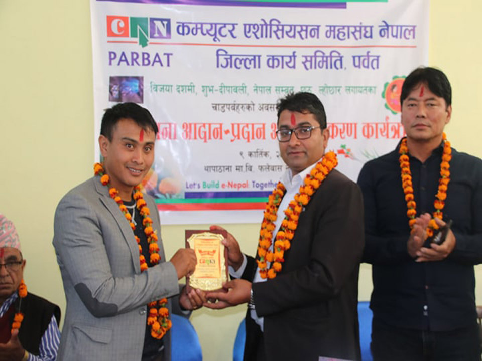 पर्बत । फलेवास नगरपालिकाको वडा नं. २ थापाठाना मा.बि.मा नगरपालिका भित्रका विद्यालयहरुका ४५ जना कम्प्यूटर शिक्षक र प्रधानाध्यापकहरुलाई एक दिने अभिमुखी करण कार्यक्रम आयोजना गरी बिजयादशमी, शुभ-दिपावली, नेपाल सम्बत, छठ, ल्होसार लगायतका चाडपर्वको अवसरमा शुभकामना आदान प्रदान कार्यक्रम समेत सम्पन्न गरेको छ । उक्त कार्यक्रमको अध्यक्षता क्यान पर्वतको अध्यक्ष खडकबहादुर गुरुङ (मदन)ले गरेका थिए भने प्रमुख अतिथि फलेवास नगरपालिकाका नगर प्रमुख पदमपाणी शर्मा, क्यान महासंघ नेपालका केन्द्रिय सचिब जगनबहादुर गुरुङ र क्यान महासंघ नेपाल गण्डकी प्रदेश अध्यक्ष तुलसीराम पाण्डेले गर्नु भएको थियो ।