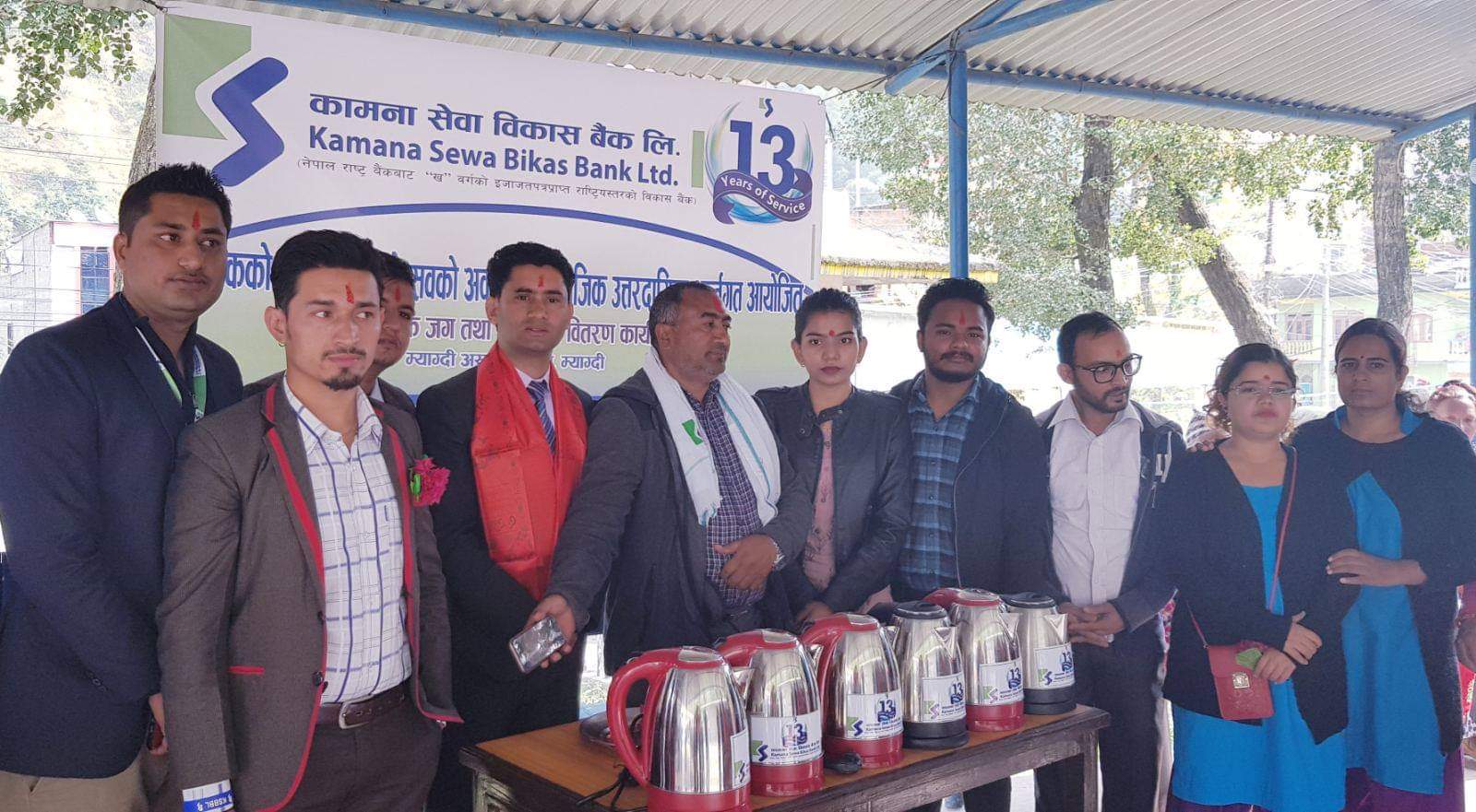 प्रगतिको आधार कामना सेवा संंग कारोवार भन्ने नाराका साथ संचालित कामना सेवा विकास बैंकले आफ्नो १३औं वार्षिकउत्सवको उपलक्ष्यमा बेनि अस्पतालमा १३ थान इलेक्ट्रोनिक जग तथा विरामीहरुका लागि स्वास्थ्य लाभको कामना सहित फलफुल वितरण गरेको छ ।