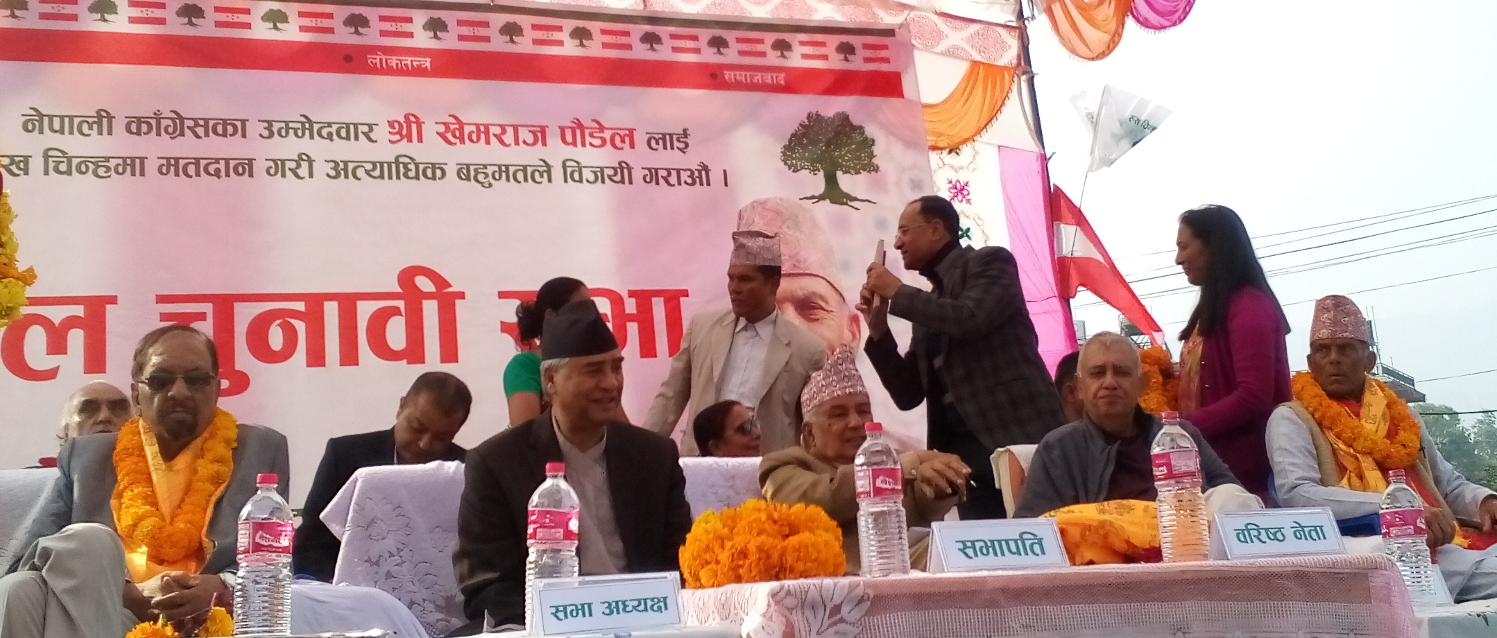 उनले उम्मेदवार खेमराज पौडेललाई तपस्वी नेताको संज्ञा दिए । साथै खेमराजको सम्मानका लागि अत्यधिक मत दिएर जिताएर पठाउन आग्रह गर्दै नेता पौडेलले खेमराजको जितसंगै मुलुकको मुहार फेरिने दावी गरे । उनले भने, ‘खेमराजले चुनाव जितेर सांसद मात्रै बन्दैनन्, अधिनायकवादी कम्युनिष्ट सरकारलाई लोकतान्त्रिक बाटोमा हिंडाउन पनि सघाउँछन् ।’ महामन्त्री डा. सशांक कोइरालाले कम्युनिष्ट सरकारले मुलुकलाई भेनेजुयला र रुवाण्डा बनाउन लागिपरेको आरोप लगाए । ‘सरकार मुलुकको हितमा, जनताको हितमा, लोकतन्त्र, संविधानको हितमा, संघीयता, गणतन्त्र, समावेशिताको हितमा छैन’, उनले भने, ‘सरकार सच्चिनका लागि पनि यो चुनाव कांग्रेसले नै जित्न आवश्यक छ ।’