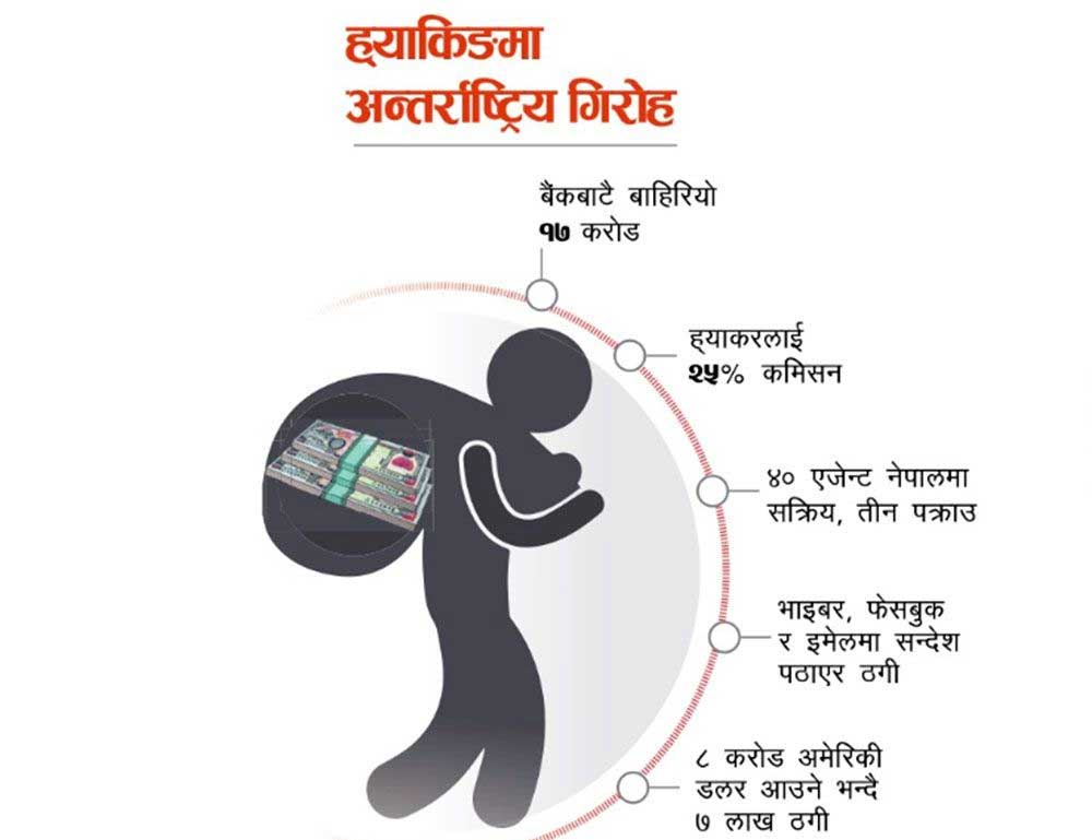 काठमाडौं, । दुई वर्षअघि मकवानपुरका राहुल शर्मा (नाम परिवर्तन) लाई एक अपरिचित युवतीले विदेशबाट भाइबरमा सम्पर्क गरिन् । नचिनेको नम्बरबाट भाइबरमा सन्देश आएपछि राहुलले सुरुमा चासो दिएनन् । ती युवतीले उनलाई पुन: सन्देश पठाइन् । ‘म स्ट्यान्डर्ड चार्टर्ड बैंक इन्डोनेसियाको कर्मचारी हुँ, मेरा आफन्त सेलिङ सुमनका नाममा बैंकमा ८ करोड यूएस डलर छ, सुमनको निधन भएका कारण बैंकको रकम झिक्न पाएको छैन, मलाई तपाईंको हेल्प चाहिएको छ,’ विदेशी महिलाबाट यस्तो सन्देश पाएपछि राहुल दंग परे । लोभिए । अनि भाइबरमै ती युवतीलाई जवाफ पठाए, ‘यसमा म तपाईंलाई के सहयोग गर्न सक्छु ?’युवतीले तुरुन्तै लेखिन्, ‘तपाईं बैंकमा भएको सुमनको प्रोपर्टी दाबी गर्न यहाँ आउनुपर्यो, यसका लागि ‘सेलिङ अफ सुमन एट जिमेल डटकम’ ठेगानाको इमेल खाता खोल्नुपर्छ ।’