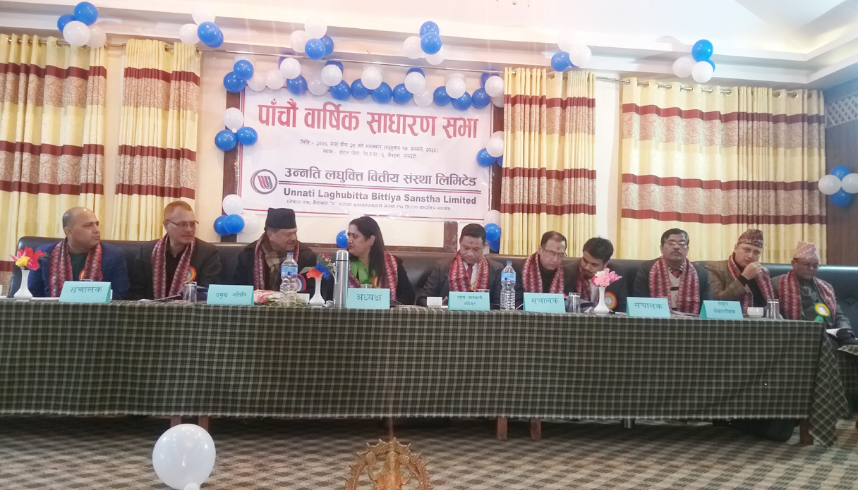 भैरहवा, । भैरहवामा केन्द्रिय कार्यालय रहेको उन्नती लघुवित्त वित्तीय संस्था लिमिटेडले पाँचौं बार्षिक साधारण सभा सम्पन्न गरेको छ । संस्थाले सञ्चालक समीति अध्यक्ष अनिता ढुङ्गाना शाह अध्यक्षता, संघीय सांसद भरत शाहको प्रमुख आतिथ्यता र मानव संसाधन तथा सामान्य सेवा विभागिय प्रमुख लाल बहादुर रावलको सञ्चालनमा भैरहवाकै होटेल पौवामा पाँचौं बार्षिक साधारण सभा सम्पन्न गरेको हो । उक्त साधारण सभामा कम्पनी सचिव एवं संस्थाका प्रमुख कार्यकारी अधिकृत प्रेम बहादुर पाठकले संस्थाको भावी योजनाहरुको बारेमा सभालाई जानकारी गराउँदै पाँच समान्य र १६ वटा विशेष प्रस्तावहरु राखेका थिए भने उक्त प्रस्तावको दशौं नम्बरमा हक हस्ताण्तरण सम्बन्धी एक प्रस्ताव थपिए पछि १७ वटा विशेष प्रस्तावहरु पारित भएका छन् ।