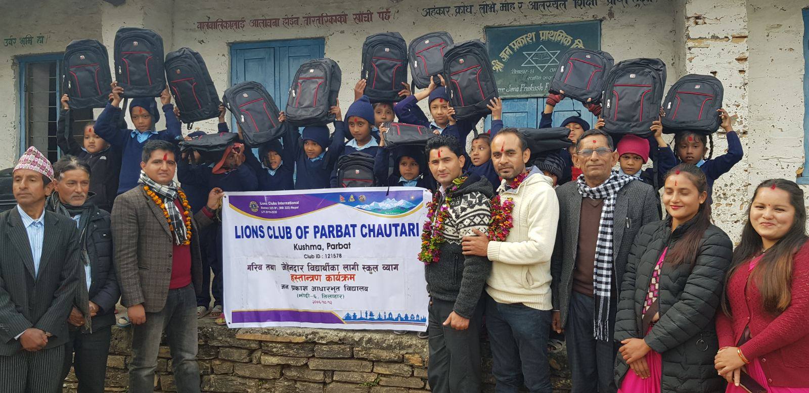 हामी सेवा गर्छौ भन्ने मुल मन्त्रका साथ विश्का १५० भन्दा वढि मुलुकमा फैलिएको लायन्स कलव ईन्टरनेशनल अन्र्तगत पर्वतमा क्रृयासील लायन्स कलव अफ पर्वत चौतारीले आफनो नियमित कार्यक्रम अन्र्तगत जन प्रकाश आधारभुत बिद्यालय मोदि ६ तिलाहार का १५ जना गरिव तथा जेहेन्दार विद्यार्थिहरुलाई ब्याग हस्तान्त्रण गरेको हो । कामना सेवा विकास वंैक वाग्लुङ्ग शाखाका शाखा प्रवन्धक धु्रव पौडेलको सहयोगमा उक्त कार्यक्रम सम्पन्न भएको हो । प्रवन्धक पौडेलले आफनो खाजा खर्च कटाएर वार्षिक रुपमा समाजिक कार्य गर्दै आउनुभएको छ ।