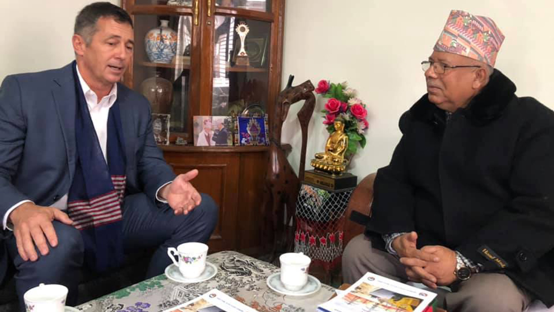 काठमाडौं । नेपाल कम्युनिष्ट पार्टी (नेकपा) का वरिष्ठ नेता तथा पूर्वप्रधानमन्त्री माधवकुमार नेपाल र नेपालका लागि अमेरिकाका राजदूत ¥याण्डी डब्ल्यू बेरीबीच शिष्टाचार भेटघाट भएको छ । नेता नेपालको निवास कोटेश्वरमा उहाँहरुबीच भेटघाट भएको थियो । नेता नेपालका स्वकीय सचिव नितेश पौडेलका अनुसार भेटमा मिलेनियम च्यालेञ्ज कर्पोरेशन (एमसिसी) का बारेमा पनि छलफल भएको थियो ।