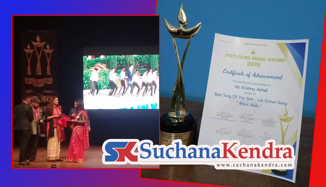 शहरी बिकाश राज्यमन्त्री को उपस्थितिमा बिहिबार काठमाण्डौ को नाचघरमा आयोजित ज्योति फिलिम्स म्युजिक अवार्डमा उक्त अवार्ड प्राप्ता भयको हो । चर्चित गायक कृष्ण अखेली र सरस्वती लामिछाने को आवाजमा रहेको उक्त गित अहिले देश देखि विदेश सम्म सबैको जन जिब्रोमा झुण्डीएको छ यो अवार्ड ले आफुलाई अझै उर्जा प्राप्ता भयको गायक अखेलिको भनाइ छ ।