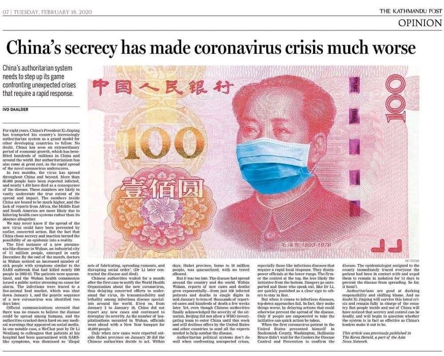 सम्राट जिसी, रुपन्देही । द काठमाडौं पोस्ट राष्ट्रिय दैनिकमा कोरोनो भाइस सम्बन्धित समाचारमा चिनका सर्वोच्च नेता माओ त्से तुङ्को तस्वीर छापे पछि चीनले आक्रोसि पोखेको हो । माओ त्से तुङ् चिनमा एक आदर्श , उच्च सम्मानित व्यक्ति मानिन्छन् ।