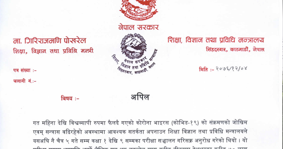 संक्रमणको त्रास रहेको यो अवस्थामा परीक्षा सकेका विद्यार्थीहरुलाई घर बाहिर नजान एवम् यो अवधिमा मुलुकको विशेष परिस्थितिलाई ध्यानमा राखि बिद्यालयमा साँस्कृतिक कार्यक्रम, वार्षिक अभिभावक दिवस, नतिजा सार्वजनिकरण, प्रवेश परीक्षा वा भर्नाका नाममा भिडभाड वा आम भेला नगर्न सबैमा अनुरोध गरिएको छ ।
