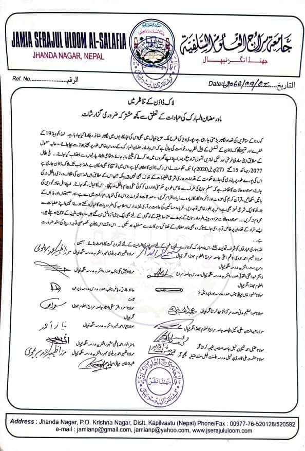 २०७७ साल बैशाख १५ गते सम्म नेपाल सरकारले लाकडाउनको घोषणा गरि सकेको कुरा सबैमा अवगत नै छ। लाकडाउन जारी रहेको बेला पूर्ण रुपले लाकडाउनको पालना गर्न को लागि अनुरोध रहेको छ। सरकारको यो निर्णय इस्लाम धर्म को विरुद्ध छैन। लाकडाउनको उल्लंघन नगरिने वर्तमान समयको अवश्यकता रहेको छ। मुस्लिम समुदायको तर्फबाट खास गरि सरकार र समाजमा कुनै गलत सन्देश नजाओस यो बिषय लाई ध्यान मा राख्न अति अवश्यक रहेको छ।