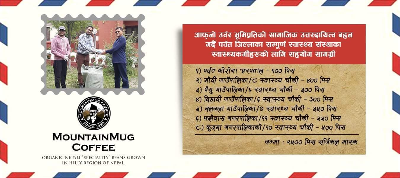 पर्वत । पर्बतमा उत्पादित कफिको प्रबर्द्धक संस्था माउन्टेन मग कफीले पर्वत जिल्लाका स्वास्थ्य संस्थामा कार्यरत स्वास्थ्यकर्मीको उपचारसेवाको सहजतालाई २५ सय थान सर्जिकल मास्क उपलब्ध गराएको छ ।