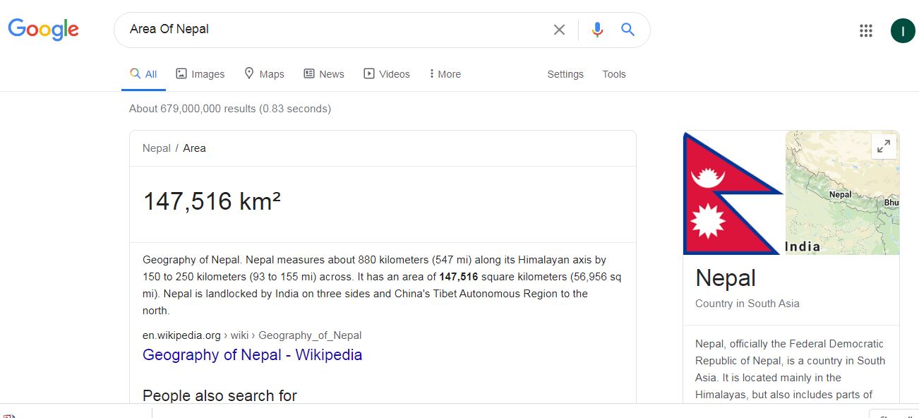 गुगलले अब नेपालको कुल क्षेत्रफल १ लाख ४७ हजार १८१ वर्ग किलोमीटर होईन १ लाख ४७ हजार ५१६ वर्ग किलोमीटर बताएको छ । नेपाल अहिले क्षेत्रफलका हिसाबले हेर्दा विश्वको ९३ औं स्थानमा रहेको छ ।