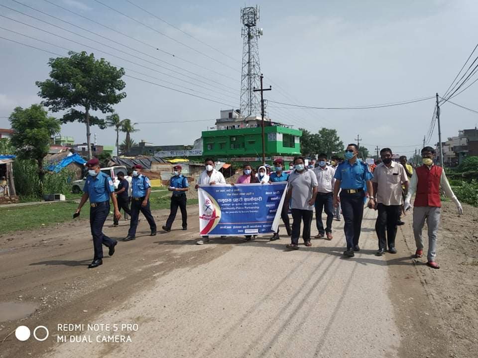 प्रहरी द्वारा बहादुरगंज,कृष्णनगर, गणेशपुर, कोरोना सचेतना र्याली निकालिएको थियो र्यालीमा सुरक्षाकर्मी, नगरपालिकाका जन प्रतिनिधि, नागरिक समाज, आफन्त नेपाल ,पुनर्स्थापना गृह , सशस्त्र प्रहरी, स्थानीय र पत्रकार लगायतको सहभागिता थियो । दुई मिटरको सामाजिक दुरी कायम गरौँ, बाहिर निस्कँदा अनिवार्य मास्कको प्रयोग गरौँ, साबुन पानीले हात धोऔँ लगायतका प्ले कार्ड बोकेका थिए ।