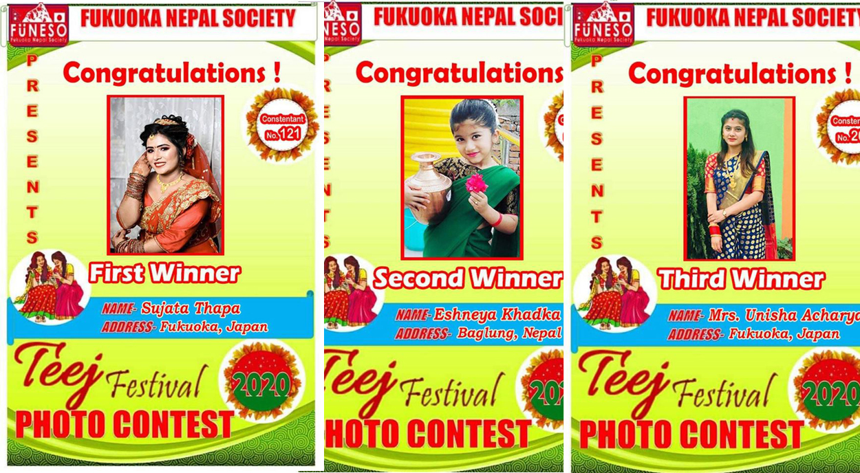 जापान । फुकुओका नेपाल सोसाइटीले हिन्दु नारीहरुको महान् चाड तीजको अवसरमा आयोजना गरेको ‘तीज फेस्टिबल कन्टेस्ट २०२०’ को विजेता घोषणा गरिएको छ । आइतबार एक कार्यक्रमबीच घोषणा गरिएको परिणाम अनुसार फुकुओकाकी सुजाता थापा प्रथम, बाग्लुङ्ग नेपालकी स्नेहा खड्का द्वितीय र फुकुओकाकै युनिषा आचार्यले सान्त्वना स्थान हासिल गरेकी छन् ।