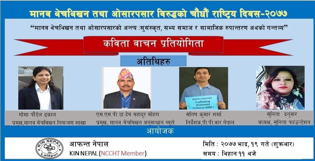 कपिलवस्तु, । मानव बेचबिखन तथा ओसारपसार विरुद्धको १४ औ राष्ट्रिय दिवसको अवसरमा विगत लामो समयदेखि मानव बेचबिखन विरुद्ध कृयाशिल रुपमा काम गर्दै आएको संस्था आफन्त नेपालले विभिन्न समयमा उद्धार गरी संरक्षणमा रहेका प्रभावित छोरीहरुको नेतृत्व बिकासका लागि कविता वाचन कार्यक्रम समापन गरेको छ।