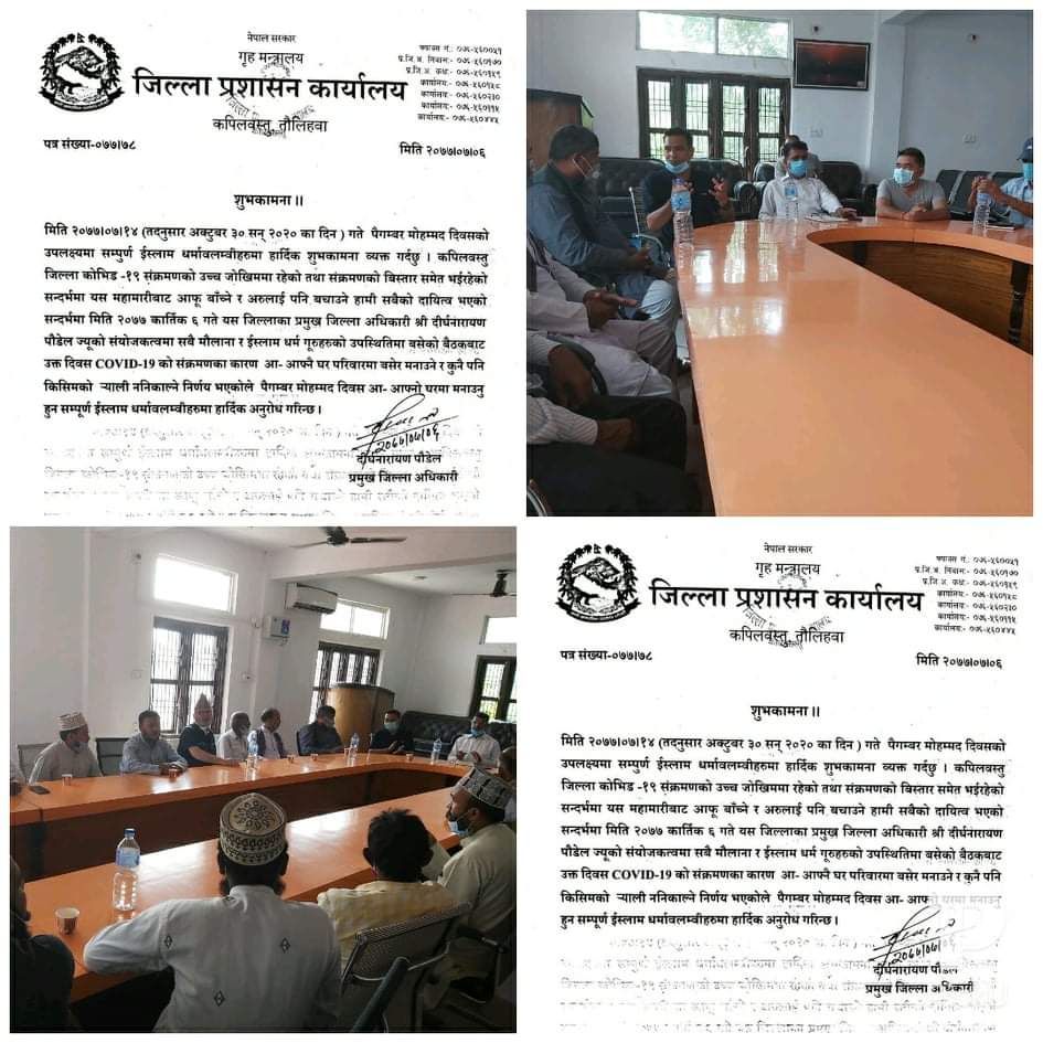 जिल्ला प्रशासन कार्यालय कपिलवस्तुले मौलाना र मुस्लिम धर्मगुरु हरूको संयुक्त छलफल समपन्न गरेको छ। उक्त छलफलमा नजिकदै गरेको पैगम्बर मोहम्मद दिवसको उपलक्ष्यमा ( COVID-19) को संक्रमणका कारण आ-आफ्नो घरमा बसेर मनाउने र कुनै पनि किसिमको र्याली ननिकाल्ने निर्णय गर्दै अनुरोध समेत गरेको प्रदेश नं ५ मदरसा बोर्ड उपाध्यक्ष मौलाना मसहूद खां नेपाली ले जानकारी दिए साथै पैगम्बर मोहम्मद दिवसको दिन सार्वजनिक बिदा समेत दिनु पर्ने माग सरकार संग राखेको उहाले बताए ।
