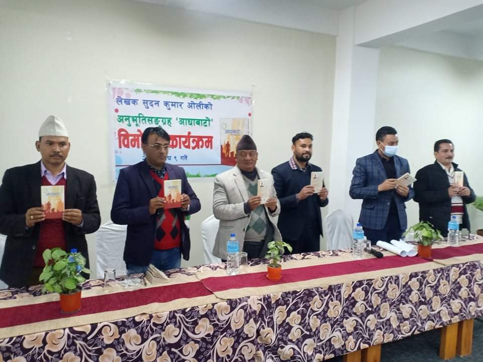 काठमाण्डौ- लेखक सुदन कुमार ओलीको १९ अनुभुतिहरुको संगालो आधावाटो आज बिमोचन भएको छ ।जिवनका धभोगाईहरु संगै अन्तर्ममनको कथाहरु जस्तै गरि बिम्वात्मक तथा बिविध बिषयका चित्रण सहितको अनुभुति संग्रह आज काठमाण्डौमा बिमोचन भएको हो ।पुस्तकलाई समालोचक महेश पौडेल,टिप्पणीकार तथा बौद्दिक ब्याक्तित्व डिललीराम शर्मा ,पुर्ब मन्त्री अमर सिंह पुन,काँग्रेस नेता मनोजमणी आर्चार्य तथा ब्याबसायी बलराम खतिवडाले संयुक्त रुपमा बिमोचन गर्नुभएको थियो ।लेखकले आफ्नो अनुभुतिमा देखेका भोगेका बिषय बस्तुहरुलाई सरल तथा सहज ढंगले प्रस्तुत गरेको र बिभिन्न कालखण्डका भोगाईको समिश्रणका रुपमा चित्रण गरेको उल्लेख गर्दै समालोचक महेश पौडेलले लेखकको शाहित्यीक यात्रा सफल र उज्वल हुने समेत कामना गर्नुभयो ।शुभ कामना तथा समालोचना गर्नुहुने अन्य बक्ताहरुले पनि वहाँको शाहित्यिक यात्रा सफलतको कामना समेत गर्नुभयो ।