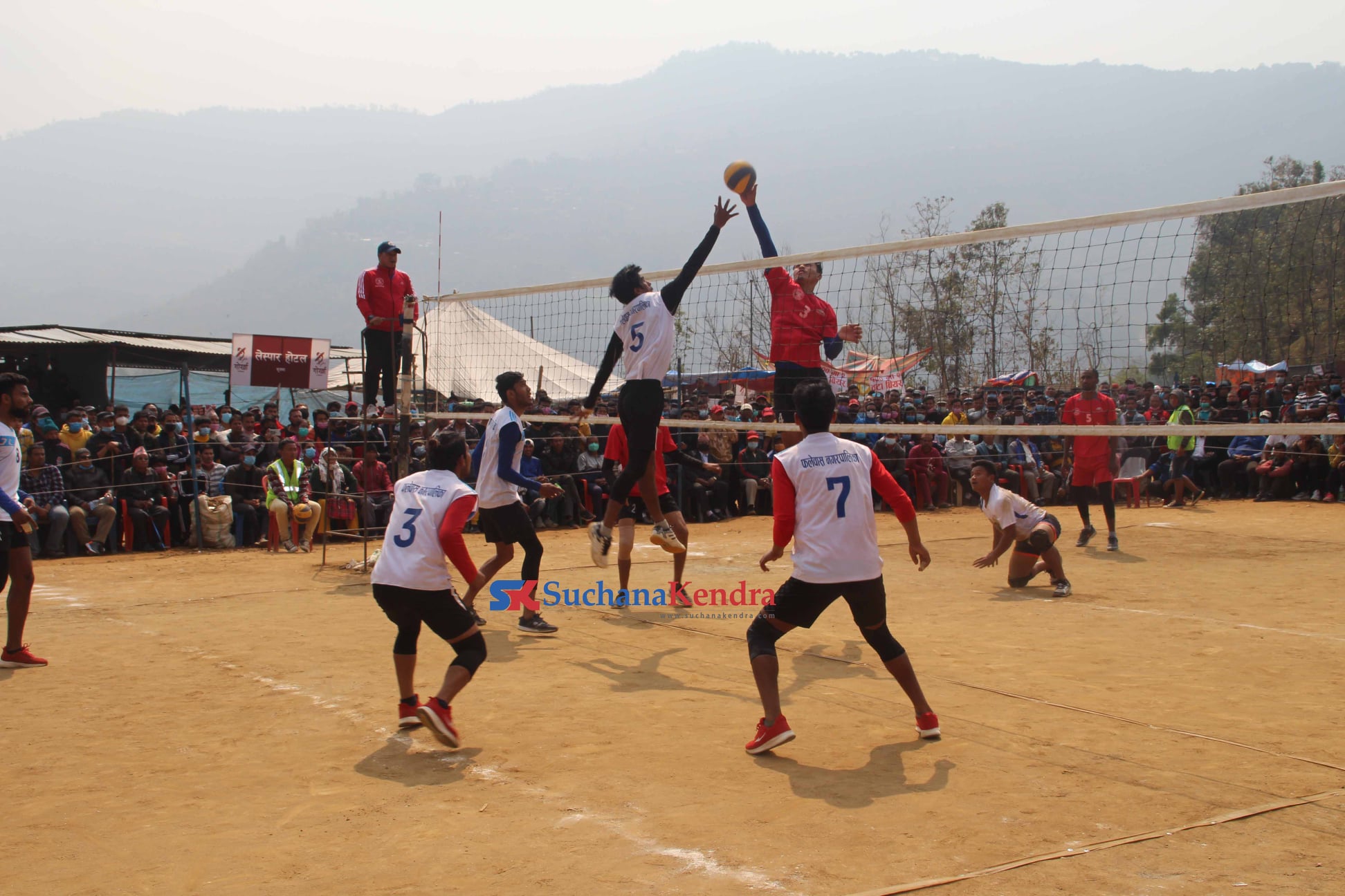 कुश्मा बजारको बढागाँउ चौरमा भएको उक्त सेमिफाइनल भिडन्तमा पहिलो सेट टाईगर ग्रुप, पोखराले १८-२५ ले गुमाएको थियो भने दोस्रो सेटमा २५-२० ले खेलमा फर्कियो तर फेरी तेस्रो सेट खानीगाउँ (ए)ले २५-२३ ले आफ्नो पक्षमा पर्यो भने चौथो सेट टाईगर ग्रुप, पोखराले २५-१९ ले जित्यो र २-२ सेट को बराबरीमा पुरायो तर अन्तिम सेट पनि सेट टाईगर ग्रुप, पोखराले १५-९ ले आफ्नो पकड मा पर्दै फाईनल प्रबेश गर्यो र उपाधि भिडन्तका लागी जिल्ला भलिबल संघ, पर्बत संग पक्का गर्यो ।