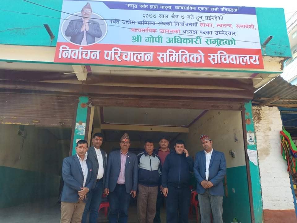 पर्वत । उद्योग बाणिज्य संघ पर्वतकाे निर्वाचन नजिकिदै गर्दा साझा, स्वतन्त्र, समाबेशी व्यावसायिक प्यानलका अध्यक्ष गाेपी अभिकारी सहित प्यानलकाे निर्वाचन परिचालन सचिवालय स्थापना गरिएको ।