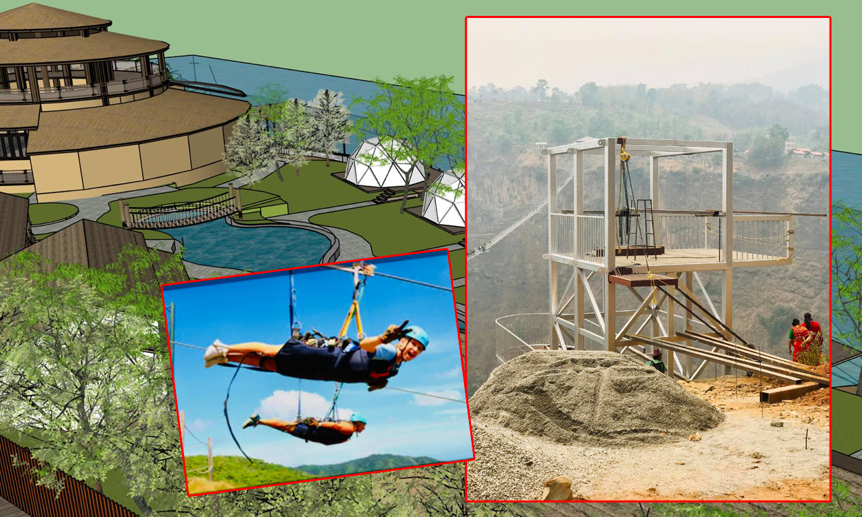 ११ करोड लागानी आँकलन गरिएको परियोजनामा बैशाख भित्र जिपलाइ सुरु गरिने र दोश्रो चरणमा एकै पटकमा चार जना खेल्न मिल्ने खेल्न मिल्ने हाइड्रोलिक पिङ, ह्युमन स्लिङसट, सिसाको स्काइ बृज र स्विमिङ पुल सहितको रिसोर्ट निर्माण गरिने कम्पनीका निर्देशक राजकुमार बस्नेतले जानकारी दिए। करिब ७० जनाको आवासीय क्षमताको बन्ने रिसोर्ट आगामी दशै सम्म निर्माण सम्पन्न गर्ने लक्ष रहेको बस्नेतले बताए।