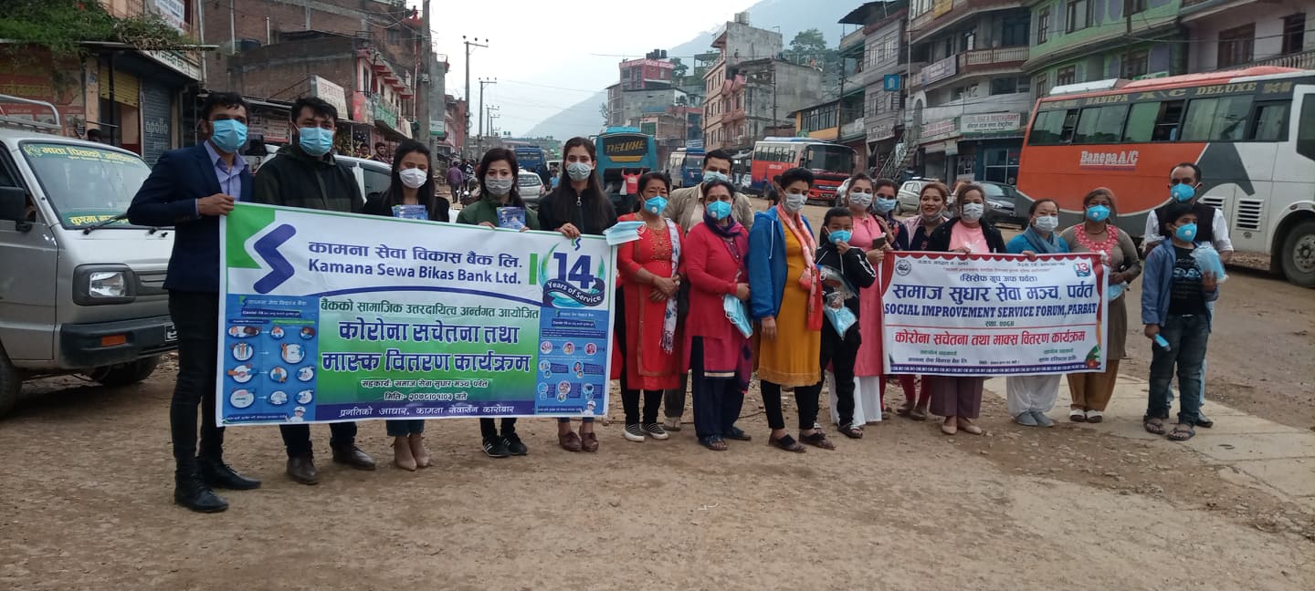 कुश्मा, पर्वत। विश्वभर माहामारीको रुपमा फैलीयको कोरना भाईरस सम्वन्धी जनचेतना जगाउने अभिप्रायले कुश्मा स्थिीत कामना सेवा विकास वैक तथा सिसेफ नेपालको सहकार्यमा कुश्मा वजारमा एक समारोह विच मास्क, सेनिटाईजर तथा कोरना सचेतना व्रोसर वितरण गरिएको छ ।