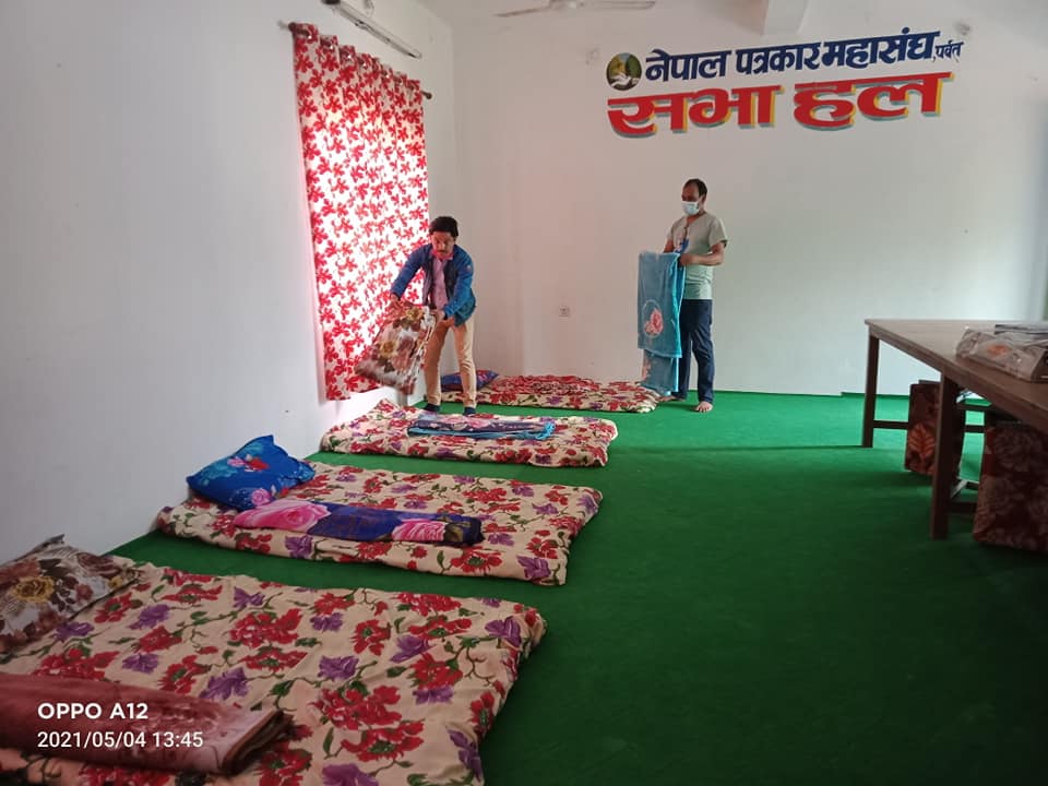 पर्वत । नेपाल पत्रकार महासंघ जिल्ला शाखा पर्वतले आफ्नो कार्यालय रहेको भवनमा ५ शैयाको आइसोलेशन कक्ष निर्माण गरेको छ । कोरोना संक्रमणको दर उच्च हुँदै जाँदा अस्पतालमा शैयाको अभाव हुने अवस्थामा उक्त शैया प्रयोग गर्न मिल्ने गरी आइसोलेसन कक्षको निर्माण गरिएको पत्रकार महासंघ पर्वतका अध्यक्ष सन्तोष थापाले जानकारी दिए ।
