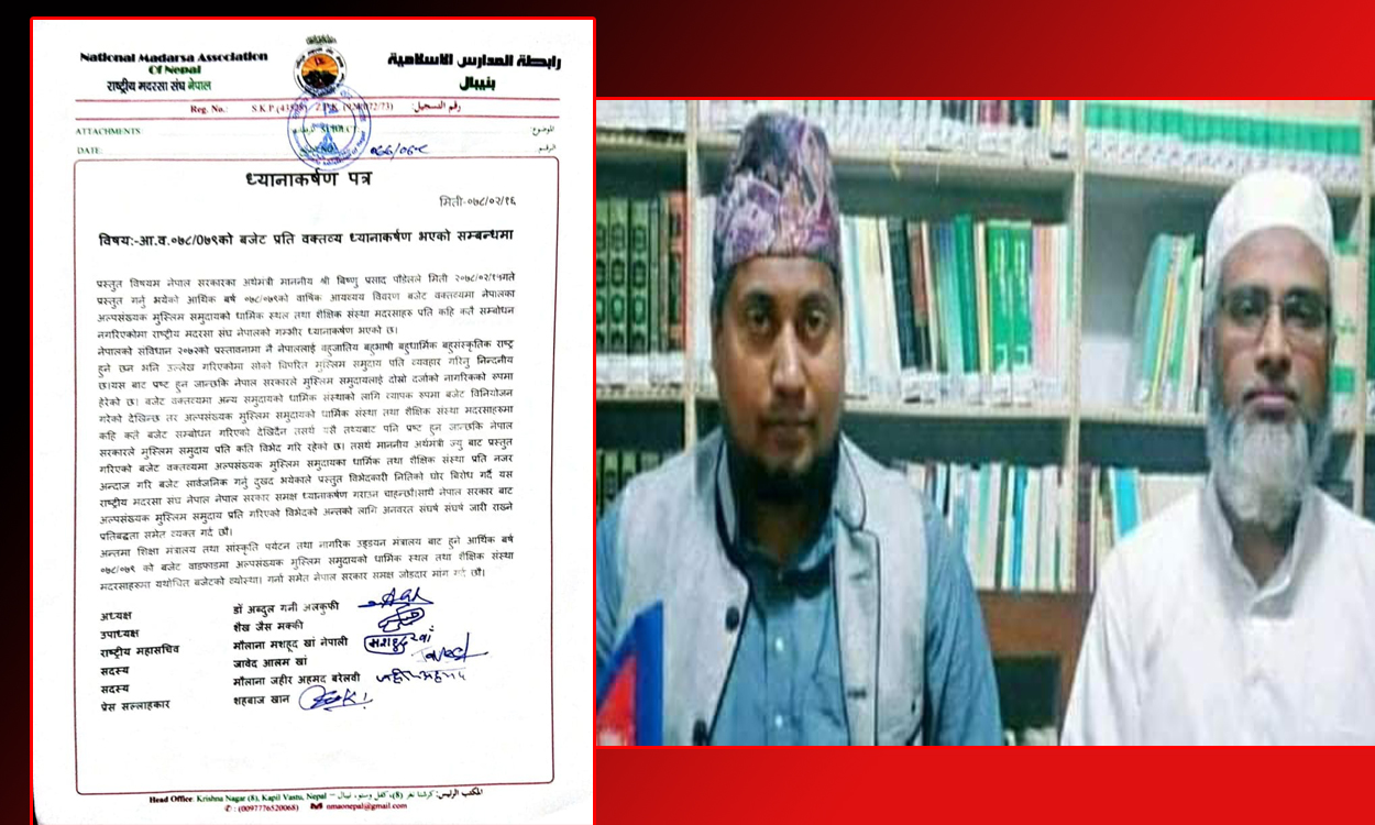कपिलवस्तु,| नेपाल सरकारले आर्थिक बर्ष ०७८/०७९ प्रस्तुत गरेको बजेट वक्तव्यमा मुस्लिम समुदायको धार्मिक स्थल तथा शैक्षिक संस्था मदरसाहरु प्रति सम्बोधन नभएको मा राष्ट्रीय मदरसा संघ नेपालले ध्यानाकर्षण पत्र निकालेर विरोध जनाएको छ।उक्त ध्यानाकर्षण पत्रमा भनिएकाे छ –