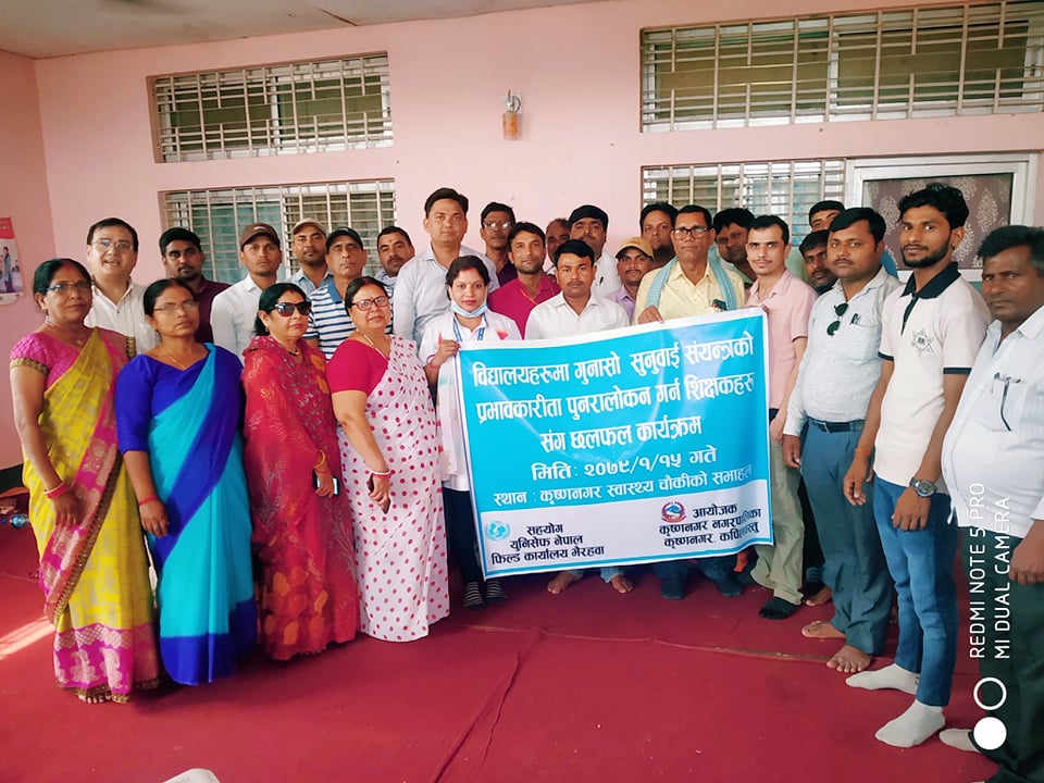 कार्यक्रमको अध्यक्षता कृष्णनगर नगरपालिका शिक्षा शाखा प्रमुख शिक्षा अधिकृत बलराम पन्थी, अतिथिमा युनिसेफ नेपालका प्रतिनिधि माधव बराल रहनुभयो ।