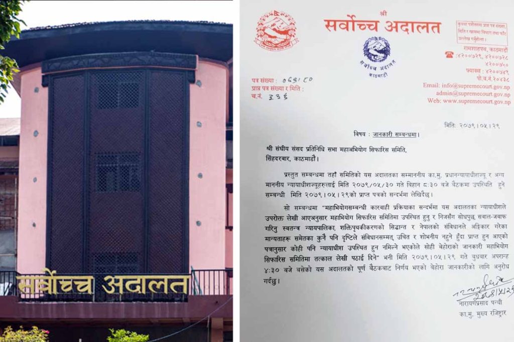 त्यसरी बैठकमा उपस्थिति हुनुलाई शक्ति पृथकीकरणको सिद्धान्त र नेपालको संविधानले अंगिकार गरेको मान्यता विपरीत हुने भनी टिप्पणी गरेको हो । निर्णयमा भनिएको छ, ‘समितिमा उपस्थित हुनु र सोधपछि सवालजवाफ गरिनु….उचित र शोभनीय नहुने हुँदा कोही पनि न्यायाधीश उपस्थित हुन नमिल्ने भएकाले समितिलाई तत्काल लेखी पठाइदिने ।’ सर्वोच्च अदालतका एक न्यायाधीशका अनुसार, संविधान र कानूनको अन्तिम व्याख्याता समेत रहेका सर्वोच्च अदालतका न्यायाधीशहरु संविधानमा उल्लेखित संसदीय सुनुवाइ बाहेक साक्षीका रुपमा कतै उपस्थित भएर धारणा वा विचार व्यक्त गर्नु उचित होइन । अर्कोतर्फ महाभियोग सम्बन्धी विषयमा कुनै कारणले संवैधानिक वा कानूनी प्रश्न उठेमा सर्वोच्च अदालतले नै न्यायनिरुपण गर्नुपर्ने हुन्छ ।