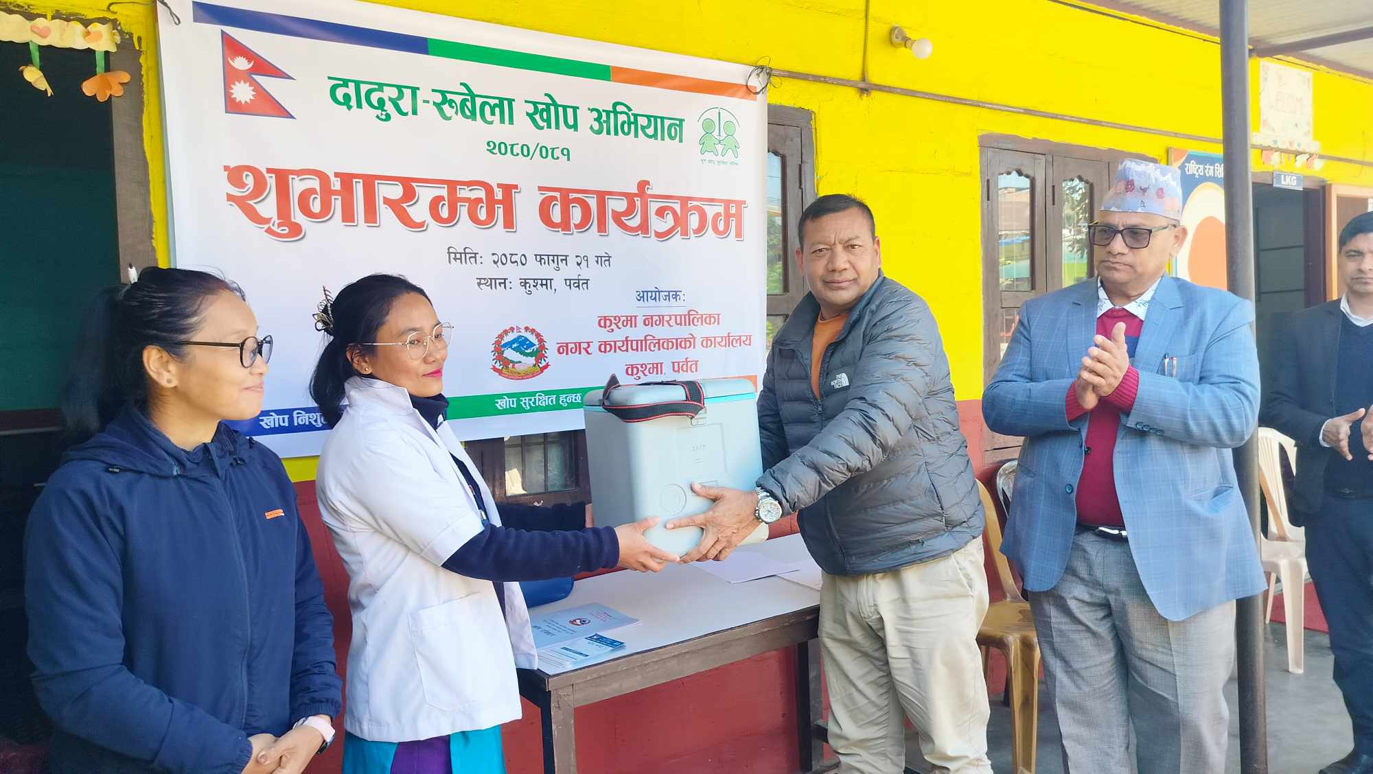 पर्वत । जिल्लाको कुश्मा नगरपालिकामा दादुरा-रुबेला विरुद्धको खोप लगाउन शुरु भएको छ । नगरप्रमुख रामचन्द्र जोशीले खोप वक्स स्वास्थकर्मी लाई हस्तान्तरण गरि अभियानको उदघाटन गर्नुभयो । सबै वडाका खोप केन्द्र, स्वास्थ्यचौकी, विधालयमा केन्द्र तोकेर २ हजार ३ सय २६ वालवालिका लाई दादुरा-रुबेला विरुद्धको खोप लगाइने भएको छ ।