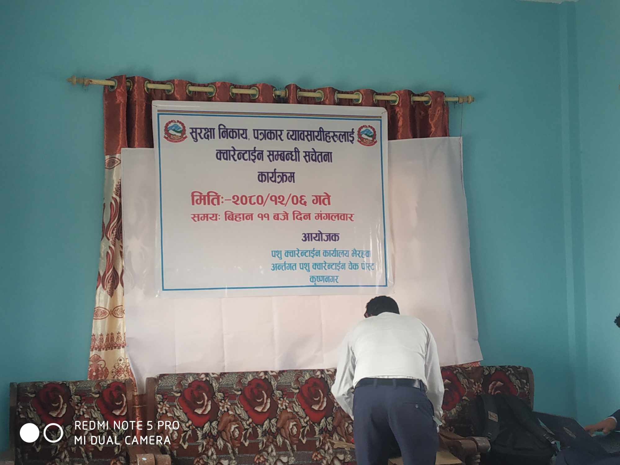 अजय मिश्र, कपिलवस्तु। कपिलवस्तु जिल्लाको कृष्णनगरमा आज पशु क्वारेन्टाइन कार्यालय भैरहवा अन्तर्गत पशु क्वारेन्टाइन चेक पोष्ट कृष्णनगरको आयोजनामा सुरक्षा निकाय, पत्रकार, व्यवसायी हरुलाई एक दिने क्वारेन्टाइन सम्बंधि सचेतना कार्यक्रम सम्पन्न भएको छ।