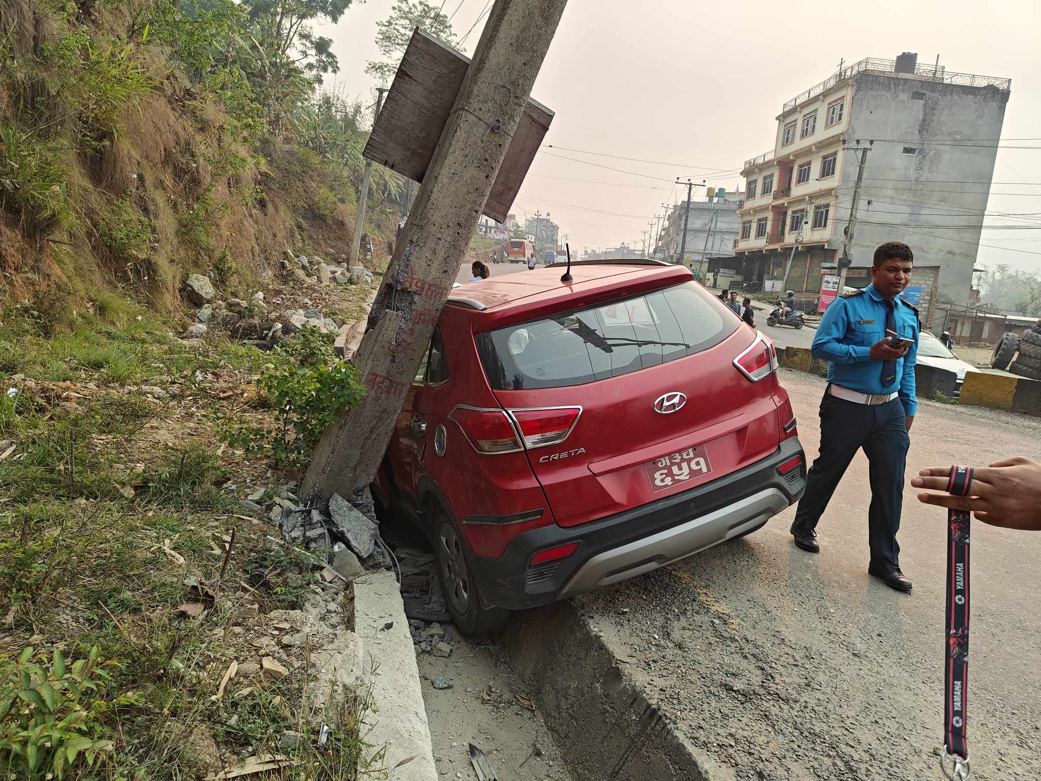 बिजुली को पोल कार को ठक्कर बाट केही पर सरेको छ ।सोमवार बिहान ६ बजेको समयमा कार दुर्घटना हुँदा ११ केभिए बिजुलीको पोल ध्वस्त भएको छ । ग१च ६५१ नं को उक्त कार दुर्घटना पछि चालक सहित कारमा सवार सबै फरार भएकाे प्रहरीले जनाएको छ ।