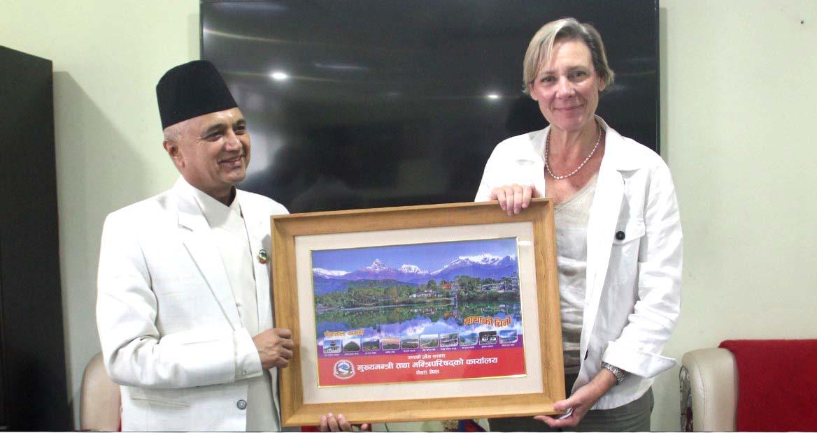 पोखरा । गण्डकी प्रदेशका मुख्यमन्त्री खगराज अधिकारीसँग नेपालका लागि युरोपियन युनियन (ईयू)का राजदुत भेरोनिक लोरेन्जोले आइतबार शिष्टाचार भेट गर्नुभएको छ । मुख्यमन्त्री अधिकारी र राजदुत लोरेन्जोसबीच मुख्यमन्त्री तथा मन्त्रिपरिषदको कार्यालय पोखरामा भेट भएको हो ।
