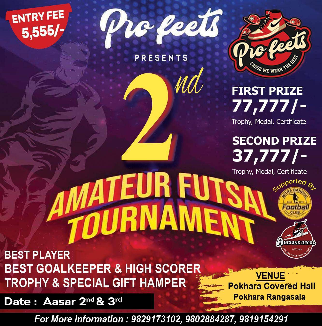 टिम दर्ता शुल्क ५ हजार ५ सय ५५ रहेको उक्त प्रतियोगितामा वेष्ट प्लेयर, वेष्ट गोल किपर, हाइ स्कोररलाई ट्रफी, स्पेशल गिफ्ट ह्याम्पर प्रदान गरिने पनि आयोजकले वताए ।