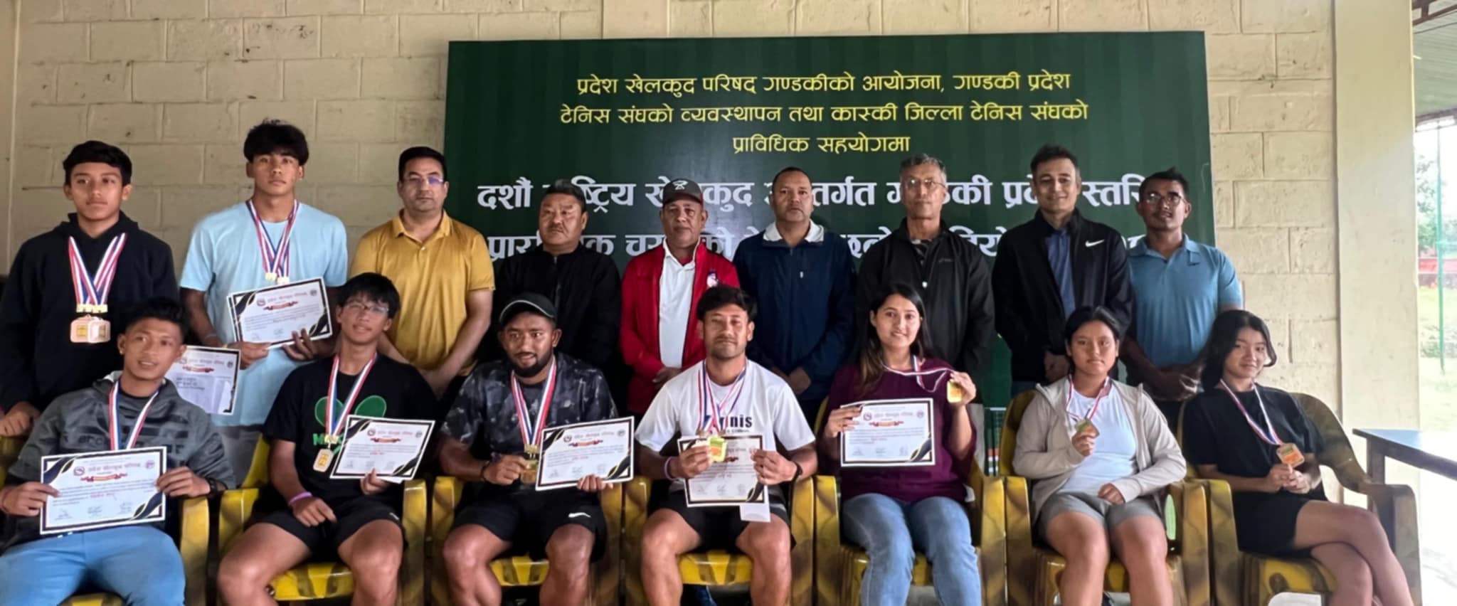 बिजेता खेलाडीहरुलाई प्रदेश खेलकुदका सदस्य केशव पाठक, गण्डकी प्रदेश टेनिस संघका उपाध्यक्ष द्वय लोक बहादुर गुरुङ र विष्णु बहादुर थापा, महासचिब नविन चालिसे, कास्की टेनिसका सचिब एवं टुर्नामेन्ट डाइरेक्टर नविन श्रेष्ठलगायतले नगद, मेडल तथा प्रमाणपत्र वितरण गरेका थिए । कार्यक्रम गण्डकी टेनिसका अध्यक्ष बिनोद कायस्थको अध्यक्षतामा भएको थियो । प्रतियोगितामा महिलातर्फ ८ र पुरुषतर्फ १६ गरी २४ खेलाडीहरुको सहभागिता रहेको थियो ।