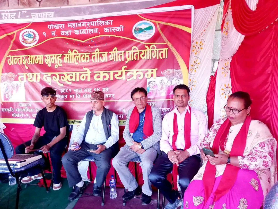 पोखरा महानगर पालिका वडा नं.१ ले हरितालिका तीज पर्वको अवसरमा अन्तर आमा समुह तीज गीत प्रतियोगिता सम्पन्न गरेको छ।संस्कृत मा. बि.को सहकार्यमा वडा भित्रका ११ वटा समुहले सहभागिता जनाएकाे प्रतियोगितामा नमुना आमा समुह प्रथम भएको छ।प्रतियोगितामा अभियान महिला समूह द्वितीय, अधिकारी टोल दिदी बहिनी समुह तृतीय र रत्न आमा समुहले सान्त्वना स्थान हासिल गरेका थिए। सिद्धार्थ आमा समुह नृत्य र महिला मैत्री आमा समुह भेषभुषा तर्फ उत्कृष्ट भएको वडाका सुचना अधिकारी श्रीराम पौडेलले जानकारी दिनुभयो। विजयी टोलीलाई गण्डकी प्रज्ञा प्रतिष्ठानका कुलपति सुर्य खड्का विखर्ची, वडाध्यक्ष साहारा प्रधानले पुरस्कार वितरण गर्नुभयो।