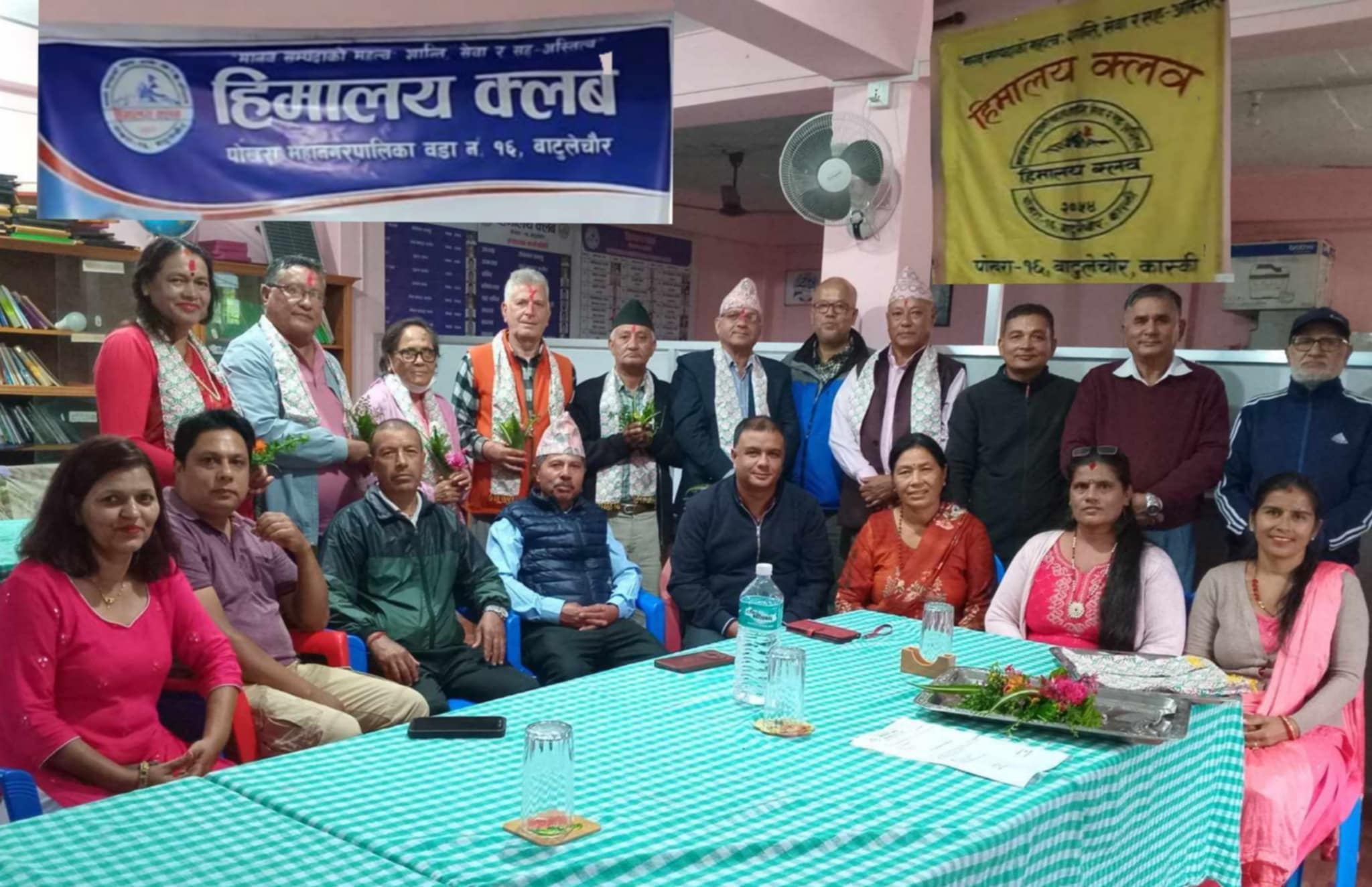 शिशिर पोखरा । पोखराको अग्रणी सामाजिक संस्था हिमालय क्लव, बाटुलेचौरले नवगठित सल्लाहकार समितिका सदस्यलाई स्वागत गरेको छ।बिहीबार एक कार्यक्रमका बीच क्लवले सल्लाहकार राजेन्द्र वहादुर देवकोटा, खिमलाल अधिकारी,कुमार श्रेष्ठ, गुरूदत्त भट्टराई, दुर्गा केसी थापा, राजकुमारी बानियाँ, चित्र वहादुर थापा, कानुनी सल्लाहकार शालिग्राम भट्टराई र पदेन सल्लाहकार वडाध्यक्ष अमृत शर्मा तिमिल्सिनालाई क्लवका पुर्व अध्यक्ष ताराप्रसाद तिमिल्सिना र निवर्तमान अध्यक्ष सुशील बस्नेतले खादा,बुके लगाएर स्वागत गर्नुभयो।