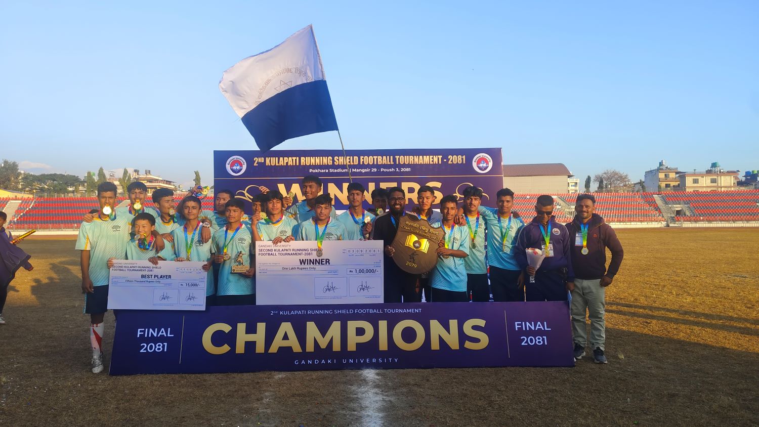 पोखरा । गण्डकी विश्वविद्यालयको आयोजनामा भएको दोस्रो कुलपति रनिबशिल्ड फुटबल प्रतियोगिताको उपाधि शहिद स्मृति माध्यमिक विद्यालयले जितेको छ । पोखरा रंगशालामा भएको फाइनल खेलमा स्टेप बाई स्टेप माध्यमिक विद्यालयलाई हराउँदै शहिद स्मृति कुलपति रनिबशिल्डको उपाधि जितेको हो । निर्धारित समयमा २–२ मा सकिएपछि खेल ट्राइबेकरमा धकेलिएको थियो ।