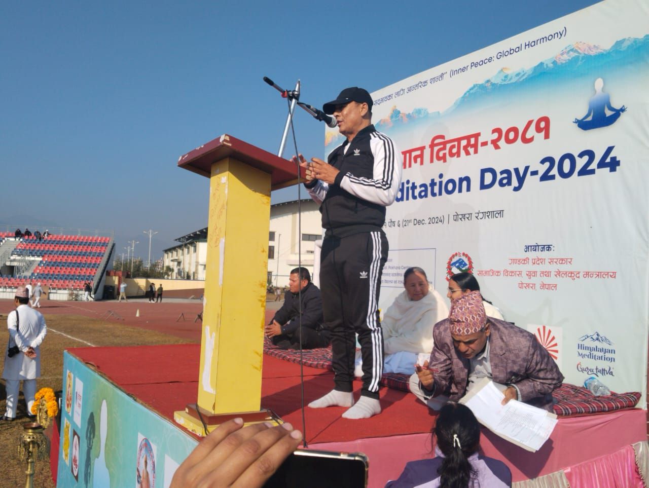 पोखरा ।गण्डकी प्रदेश सरकारका सामाजिक विकास, युवा तथा खेलकुद मन्त्री विन्दु कुमार थापाले समृद्ध र शान्त समाज निर्माणका लागि ध्यान अभ्यासलाई प्रोत्साहन गर्नुपर्ने बताएका छन् । विश्व ध्यान दिवसका अवसरमा शनिबार मन्त्रालयले पोखरा रंगशालामा आयोजना गरेको कार्यक्रमको उद्घाटन गर्दै मन्त्री थापाले ध्यानले व्यक्तिको मानसिक स्वास्थ्य, आत्मविश्वास र समग्र जीवनशैलीमा सकारात्मक प्रभाव पु¥याउने बताए ।