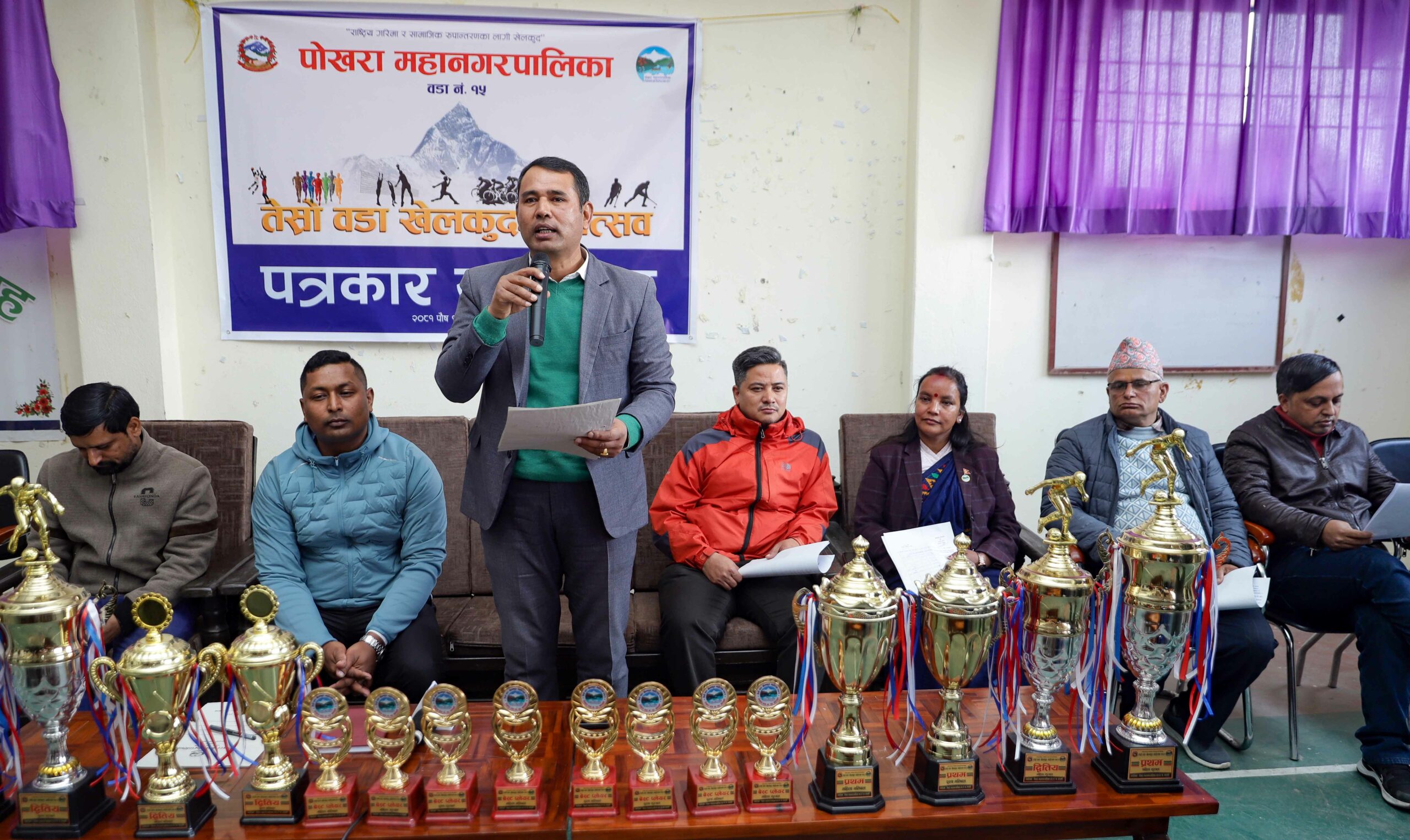 पोखरा । पोखरा वडा नं. १५ कार्यालयले आगामी माघ २ गतेदेखि बृहत खेलकुद महोत्सव गर्ने भएको छ । वडा कार्यालयले आयोजना गरेको खेलकुद महोत्सवको यो तेस्रो संस्करण हो ।माघ ६ गतेसम्म पाँच दिन चल्ने प्रतियोगितामा फुटबल, भलिबल, ब्याडमिन्टन, ह्वीलचेयर क्रिकेट, रस्साकसी, दौड, साइक्लिङ, युनी हक्की लगायतका खेलमा प्रतिष्पर्धा हुने खेल महोत्सव संयोजक एवं वडा सदस्य आशिष भण्डारीले जानकारी दिए ।