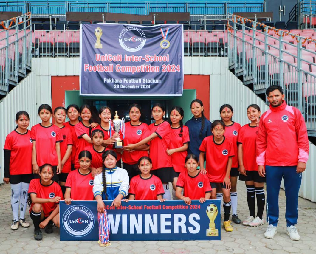 पोखरा। युनाईटेड कम्युनिटी नेपाल (युनिकन)ले शनिबार पोखरा रंगशालामा आयोजना गरेको “युनिकन अन्तर विद्यालय फुटबल प्रतियोगिता २०२४” मा छात्रा तर्फ अमरसिंह मावि प्रथम भएको छ भने छात्र तर्फ बाराही मावि प्रथम भएको छ । पाँच विद्यालयबीच भएको उक्त प्रतिस्पर्धामा छात्रा तर्फ अमरसिंह माविले कन्या माविलाई १–० ले हराउँदै विजेता बनेको हो । छात्र तर्फ भने बाराही माविले शितला माविलाई ट्राई बे्रकरमा ३–२ ले हराउँदै विजेता बनेको हो ।