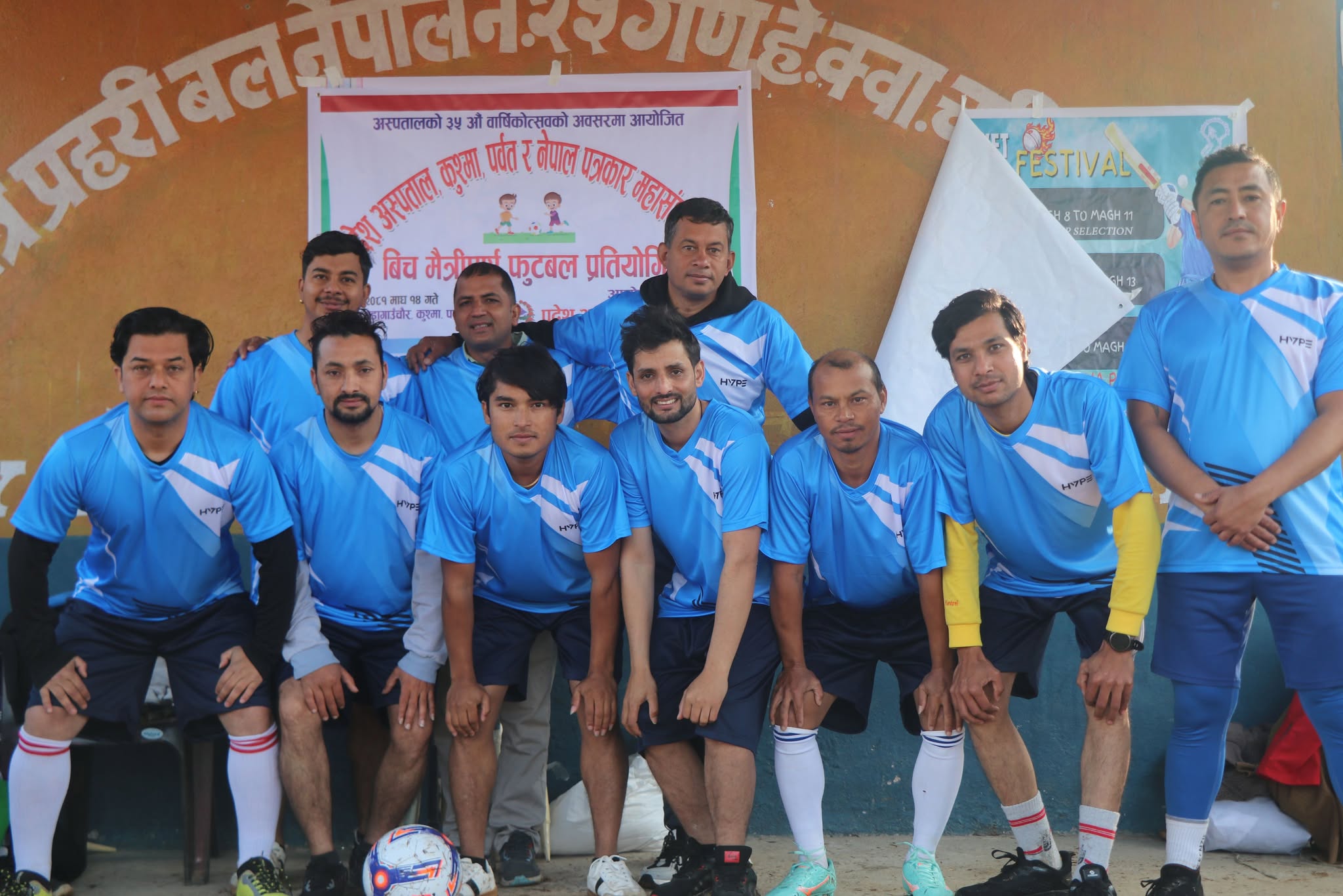 पर्वत। पर्वत अस्पताल र नेपाल पत्रकार महासंघबीच मैत्रीपुर्ण फुटबल प्रतियोगिता सोमवार कुश्मामा सम्पन्न भएको छ । प्रदेश अस्पताल पर्वतको ३५ औँ बार्षिकोत्सवको अवसरमा आयोजित प्रतियोगितामा नेपाल पत्रकार महासंघ पर्वत शाखा बिजयी बनेको छ ।