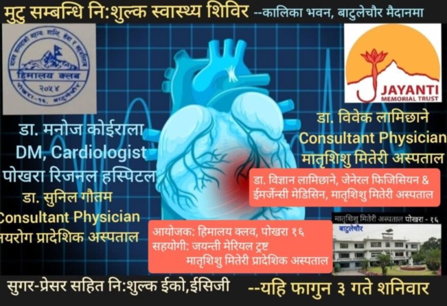 शिशिर, पोखरा। पोखराको बाटुलेचौरमा मुटु सम्वन्धी निशुल्क स्वास्थ्य शिविर हुने भएको छ । पोखराकै अग्रणी सामाजिक संस्था हिमालय क्लवको आयोजनामा आगामी फागुन ३ गते शिविर संचालन हुन लागेको क्लवका अध्यक्ष मोहन थापाले जानकारी दिनुभयो । जयन्ती मेमोरियल ट्रष्ट र मातृशिशु मितेरी प्रादेशिक अस्पतालको सहयोगमा हुने शिविरमा सुगर प्रेसर सहित निशुल्क ईको र ईसिजी सेवा प्रदान गरिने कार्यक्रम संयोजक शिवराज देवकोटाले बताउनु भयो ।