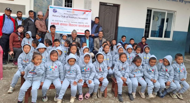 पोखरा। गण्डकी प्रदेशको दुर्गम स्थान हिमाल पारीको जिल्ला मुस्ताङको लोमन्थाङमा संचालनमा रहेको छोन्हुप जिन्जु आधारभुत विद्यालयका विद्यार्थीलाई रोटरी क्लब अफ न्युरोड पोखराले मंगलबार पोखराको हेम्जामा न्यानो कपडा वितरण गरेको छ ।