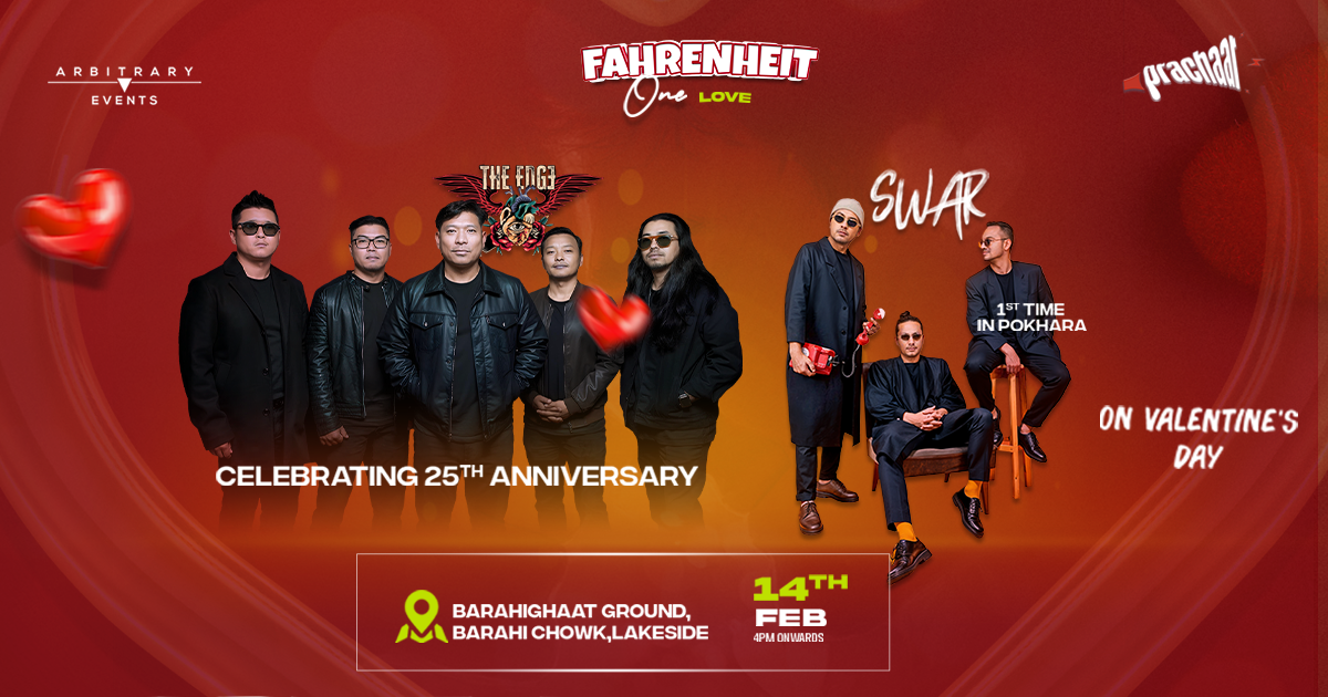 पोखरा । पोखरामा प्रणय दिवस (भ्यालेन्टाइन्स डे)मा दुई चर्चित ब्याण्ड ‘द एज ब्याण्ड’ र ‘स्वर’सहितको कन्सर्ट हुने भएको छ । भ्यालेन्टाइन्स डे अर्थात् फेब्रुअरी १४, शुक्रबार लेकसाइडको बाराहीघाटमा मुख्य आकर्षणको रूपमा यी दुई ब्याण्ड गुञ्जिने भएका हुन् । फरेन्हाइट क्लबको आयोजनामा प्रचार नेपाल र आर्बिटरी इभेन्ट्सले यो कन्सर्ट गर्न लागेका हुन् ।