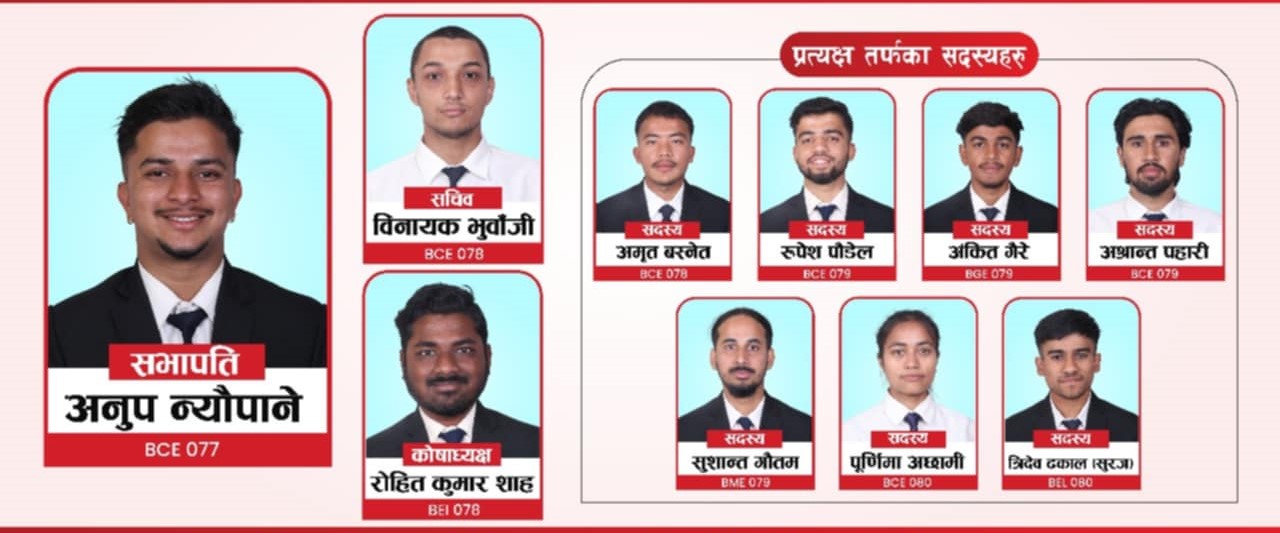 प्रत्यक्ष सदस्यमा अमृत बस्नेत, रुपेश पौडेल, अंकित गैरे, अश्रान्त पहारी, सुशान्त गौतम, पूर्णिमा अछामी, त्रिदेव ढकाल(सुरज)उम्मेद्वार रहेका छन् । समानुपातिक उम्मेदवार भने टुंगो लाग्न बाँकी छ । अध्यक्षका उम्मेद्वार न्यौपानेले इन्जिनियरिब अध्ययन क्षेत्रका समस्या आफूले प्रत्यक्ष देखेको र त्यसलाई समाधान गर्न स्ववियुमार्फत क्रियाशील रहने प्रतिबद्धता जनाए । विगतमा हुन नपाएको निर्वाचन योपटक पनि नभएमा विद्यार्थीका मुद्दा झनै ओझेलमा पर्ने उनले बताए ।
