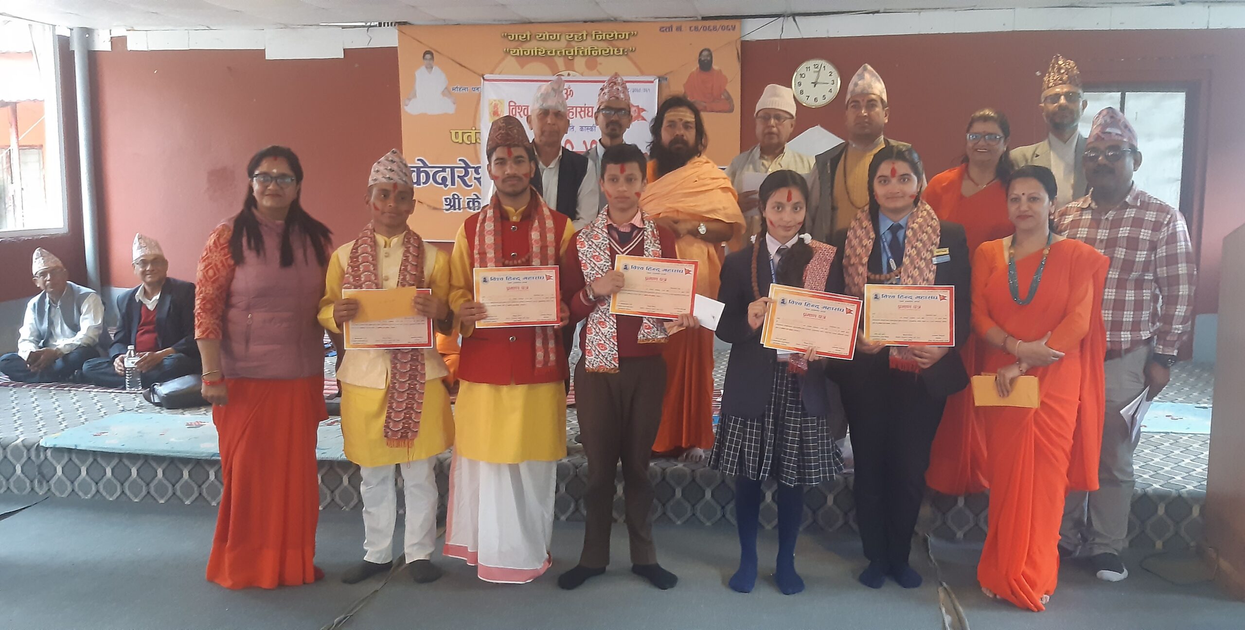 पोखरा । विश्व हिन्दु महासंघ जिल्ला कार्य समिति कास्कीको आयोजनामा सञ्चालित ।।।सनातन हिन्दु धर्म संस्कार र संस्कृतिमा गीताको महत्व’ विषयक वक्तृत्वकला प्रतियोगितामा गोगन माध्यमिक विद्यालयकी छात्रा सुजाता पौडेल प्रथम बन्नुुभएको छ । प्रतियोगितामा रिलायन्स पब्लिक स्कुलकी छात्रा दिप शिखा क्षेत्री द्वितीय बन्नुभएको छ भने नेशनल क्रियसन एकेडेमीका श्रीदेश थापाले तृतीय स्थान प्राप्त गर्नुभएको छ । त्यस्तै महर्षि गुरुकुल वेद विद्याश्रमका कुशुम बराल र सोही विद्याश्रमका सन्देश पौडेलले सान्त्वना स्थान हासिल गर्नुभयो ।
