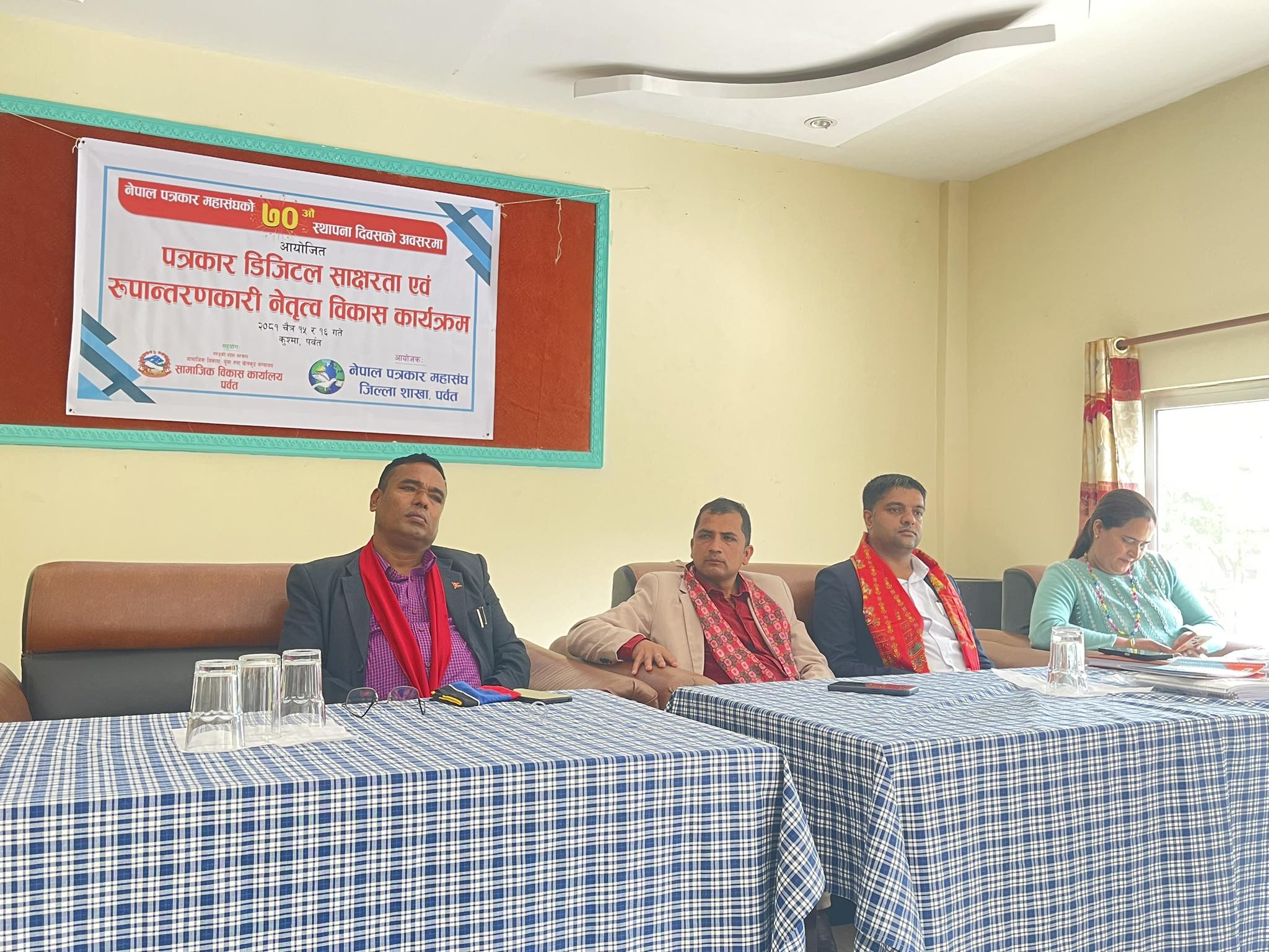 नेपाल पत्रकार महासंघ पर्वतका अध्यक्ष लक्ष्मण सापकोटाको अध्यक्षतामा सम्पन्न कार्यक्रमको स्वागत उपाध्यक्ष रञ्जना खत्री र संचालन सचिब साजन परियारले गर्नुभएको थियो ।