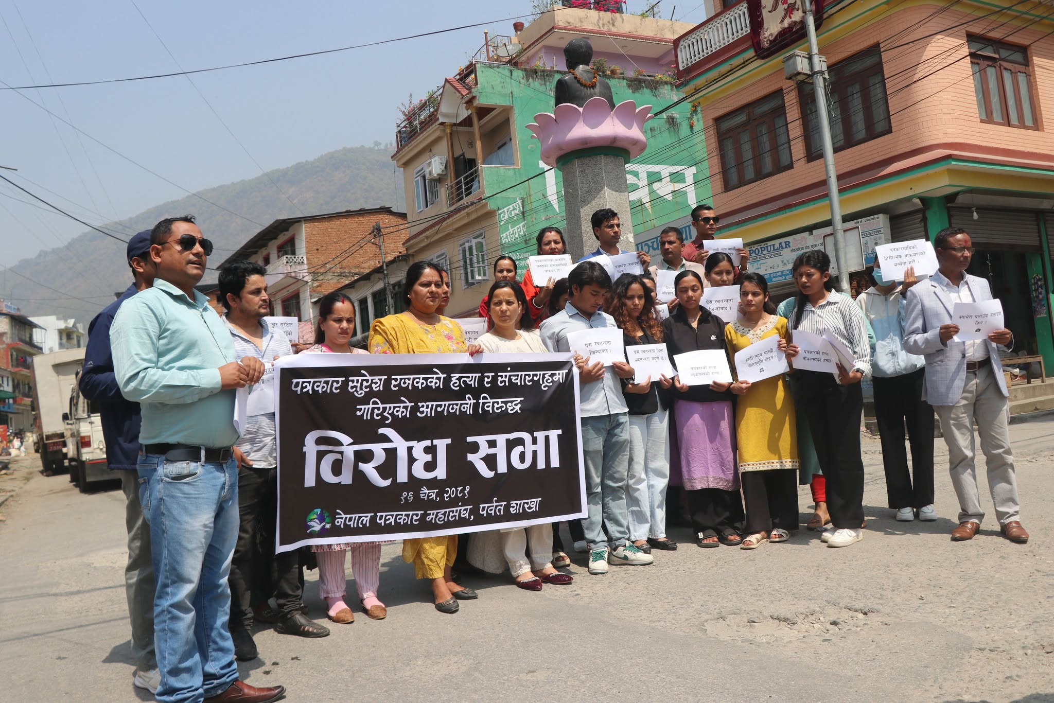 नेपाल पत्रकार महासंघ पर्वतले मौन विरोध र्यालि सहीत कोण सभा गरेको हो । कार्यक्रमलाई सम्बोधन गर्दै नेपाल पत्रकार महासंघ पर्वत शाखाका अध्यक्ष लक्ष्मण सापकोटाले जनताको सेवामा खटिएका पत्रकारको बर्बरता पूर्वक हत्या भएको घटनाको निष्पक्ष छानवीन गरी दोषीलाई हदैसम्म कार्वाही गर्न माग गरे ।